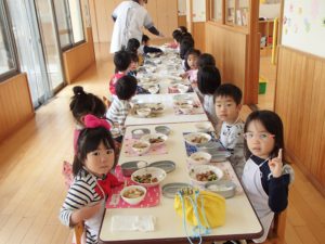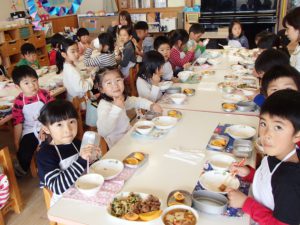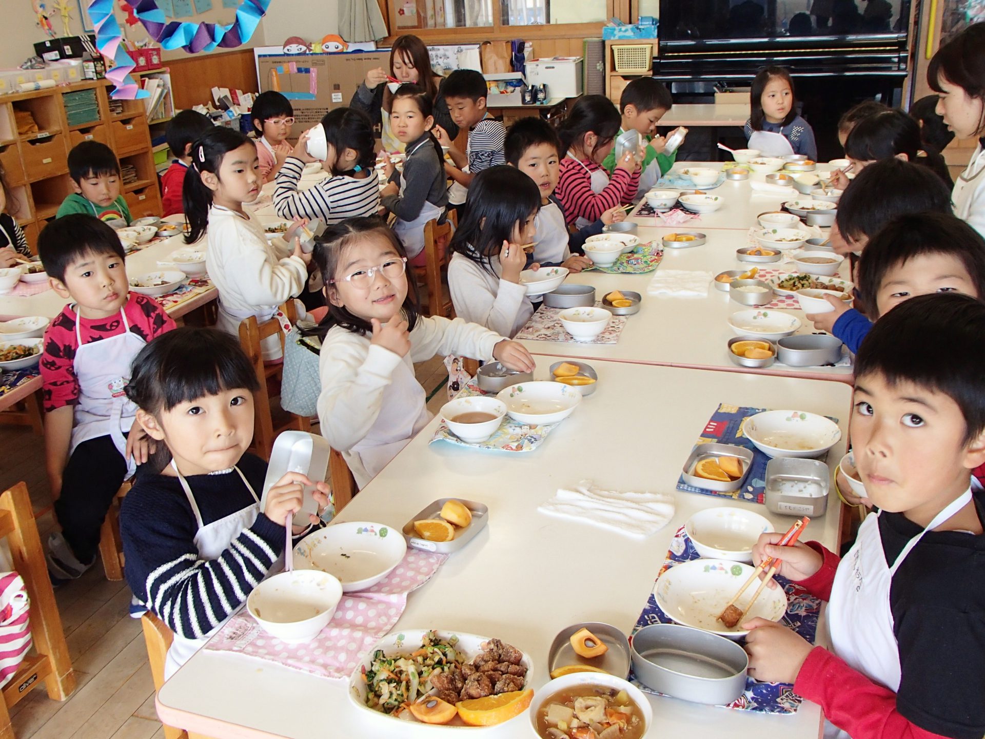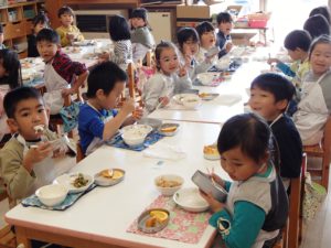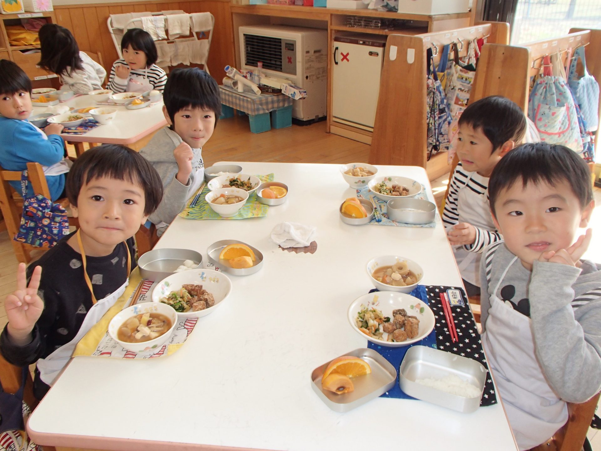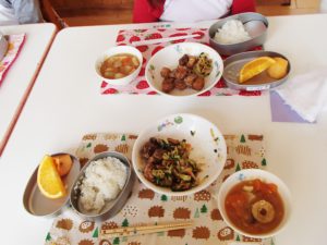 みんな、学年ごとに会食の準備、テーブルには、給食メニューと豚汁・園庭の甘柿も並びました。