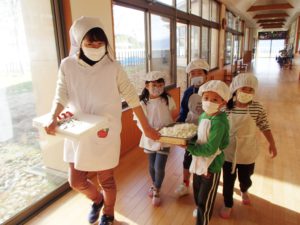 給食室のに届けに行くところでした。年長組の包丁使いも慣れたものとなりました!