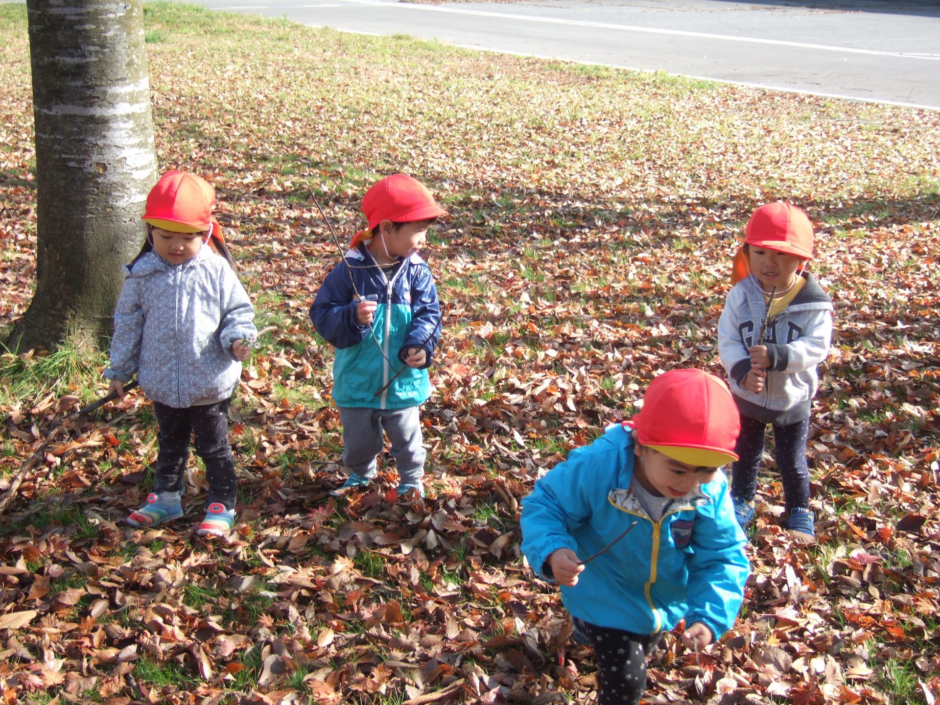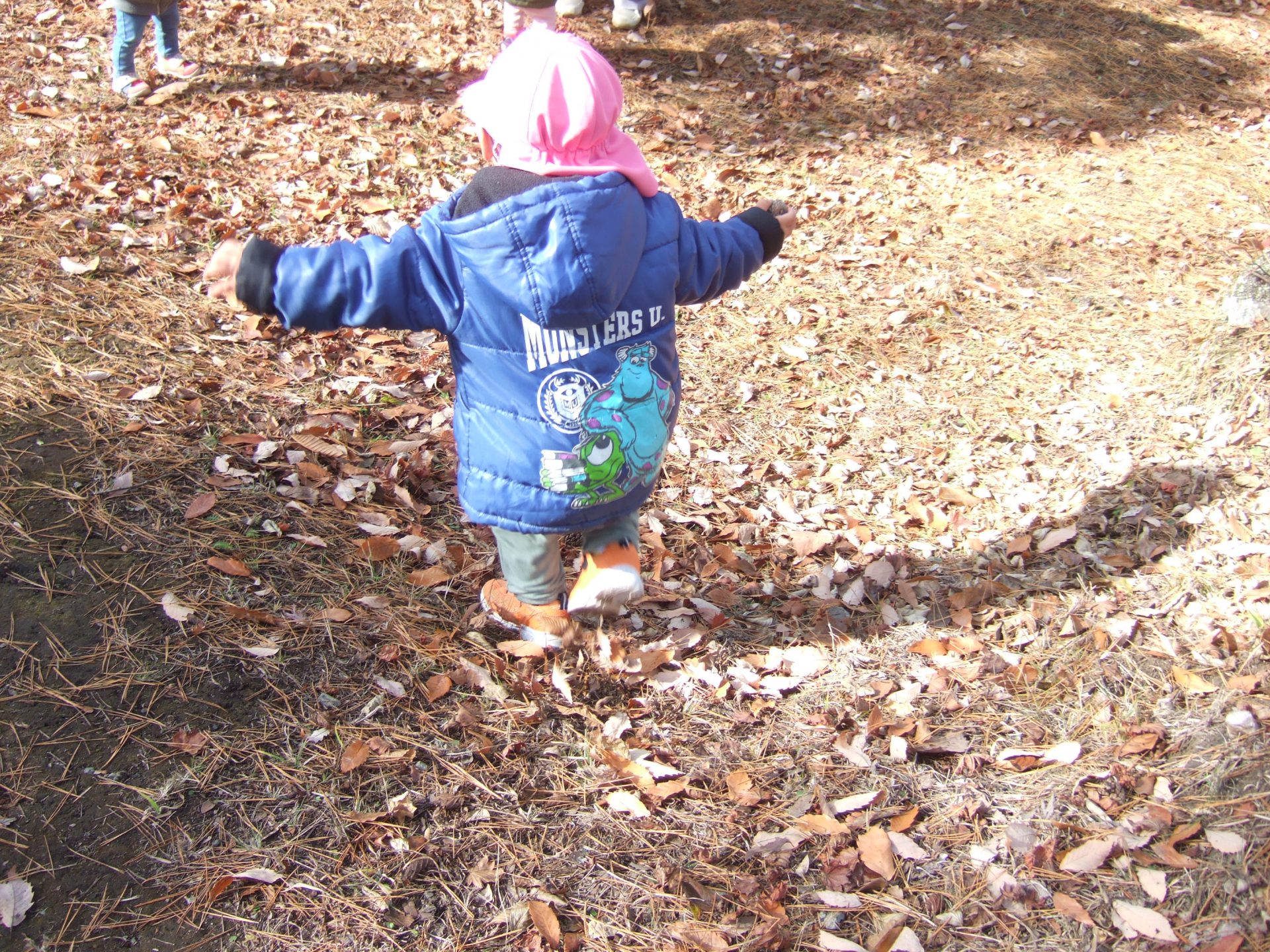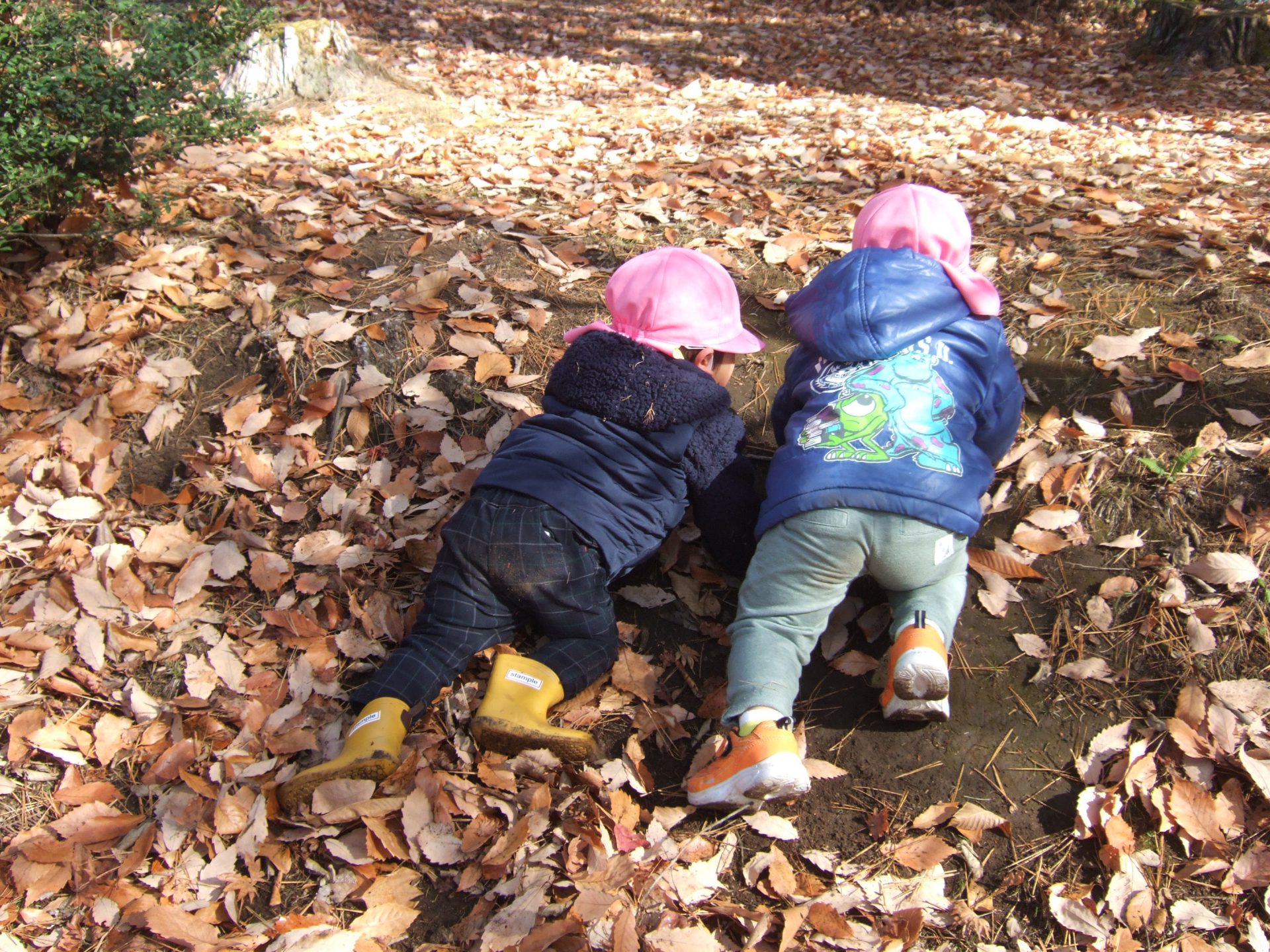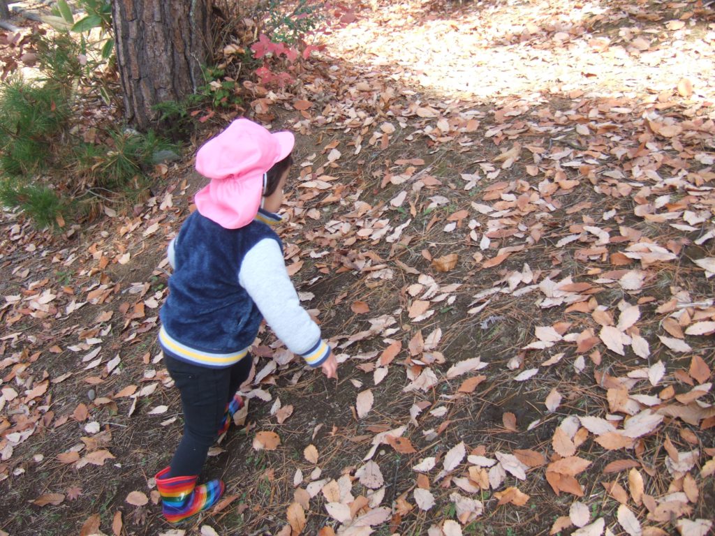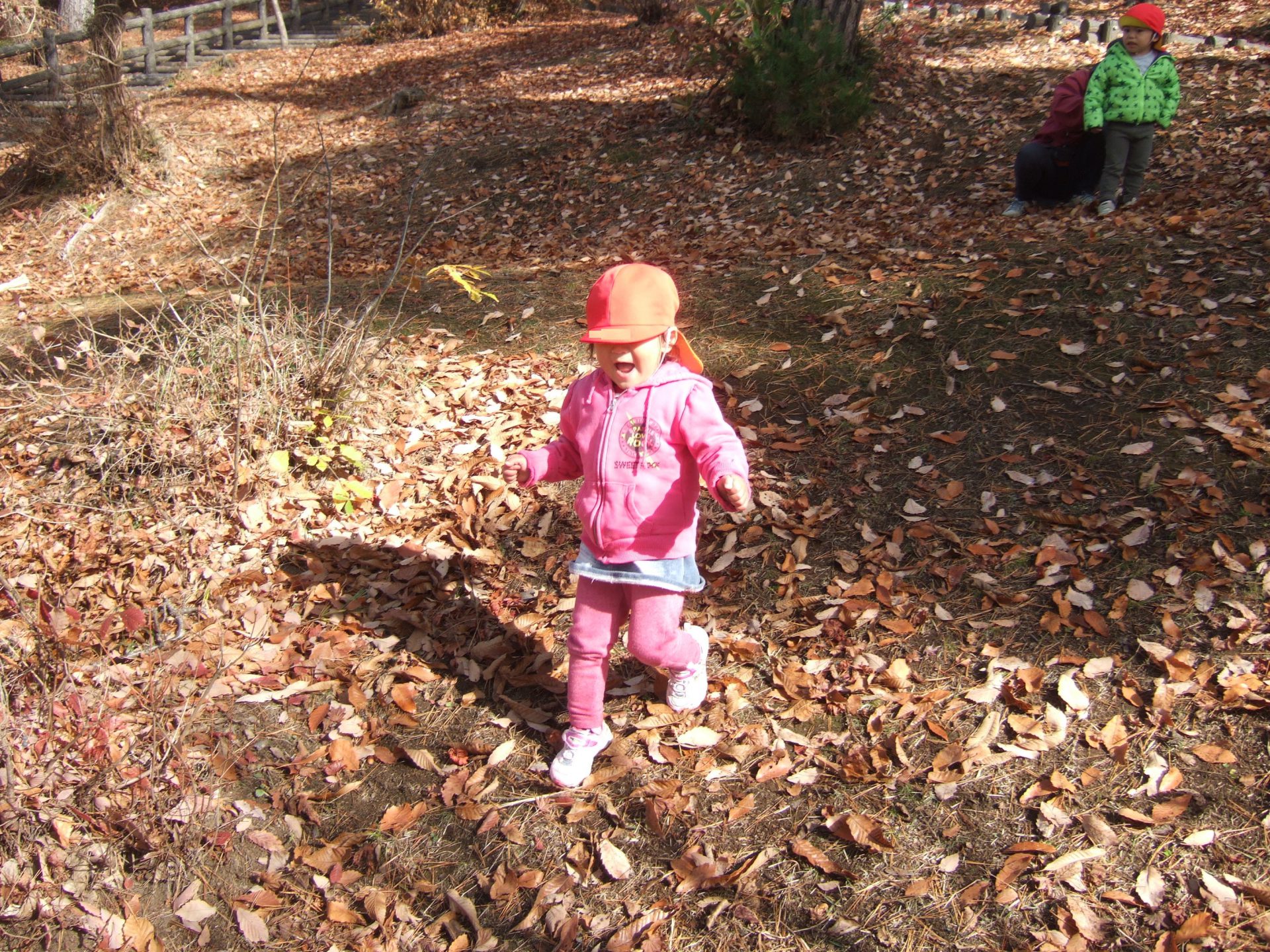 歩行がしっかりしてきて歩くことが楽しいお友達、一面の葉を踏みしめながら進みます。