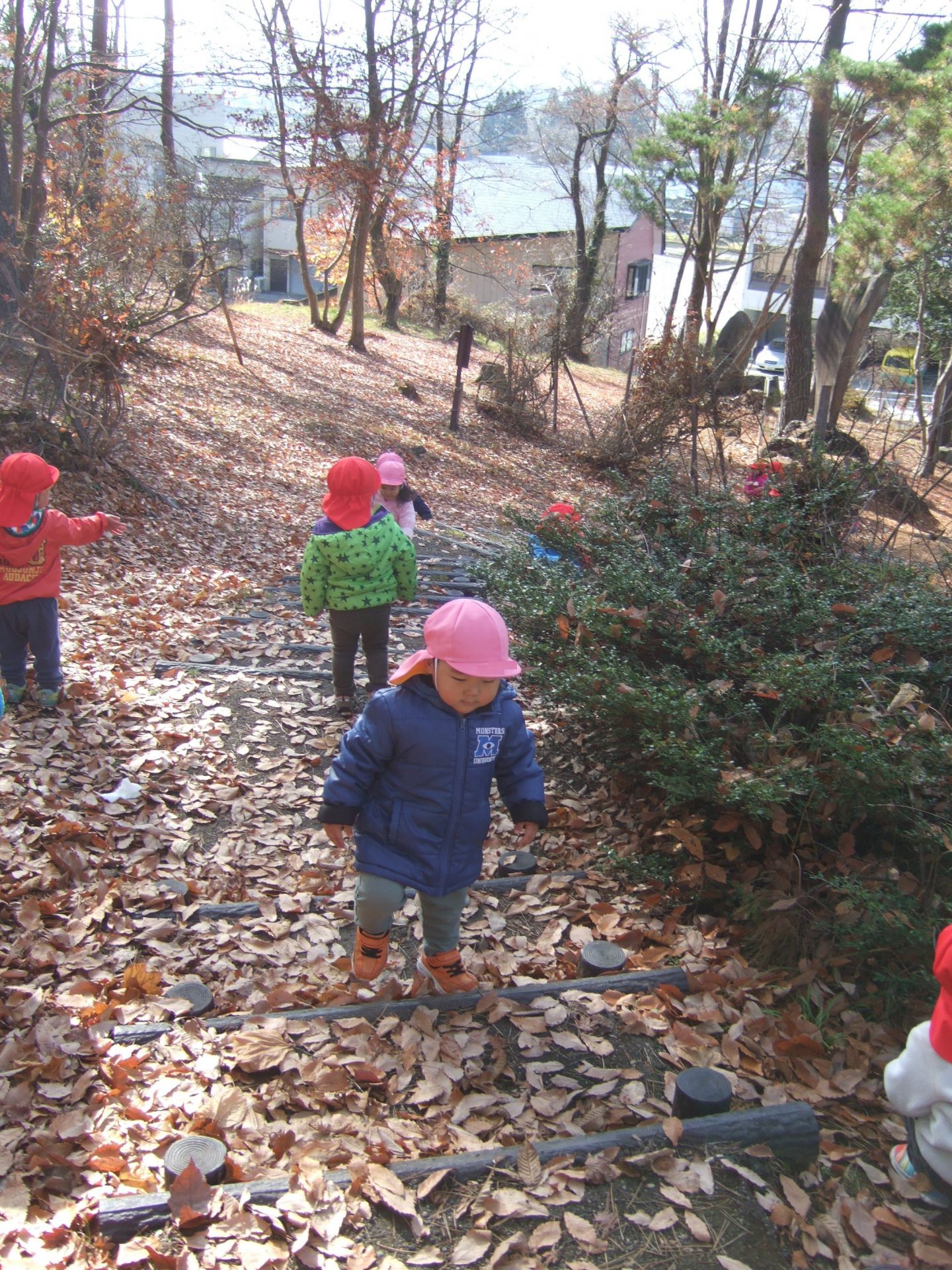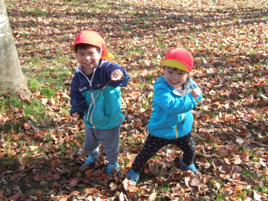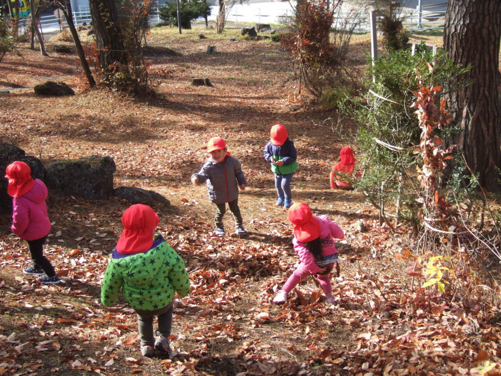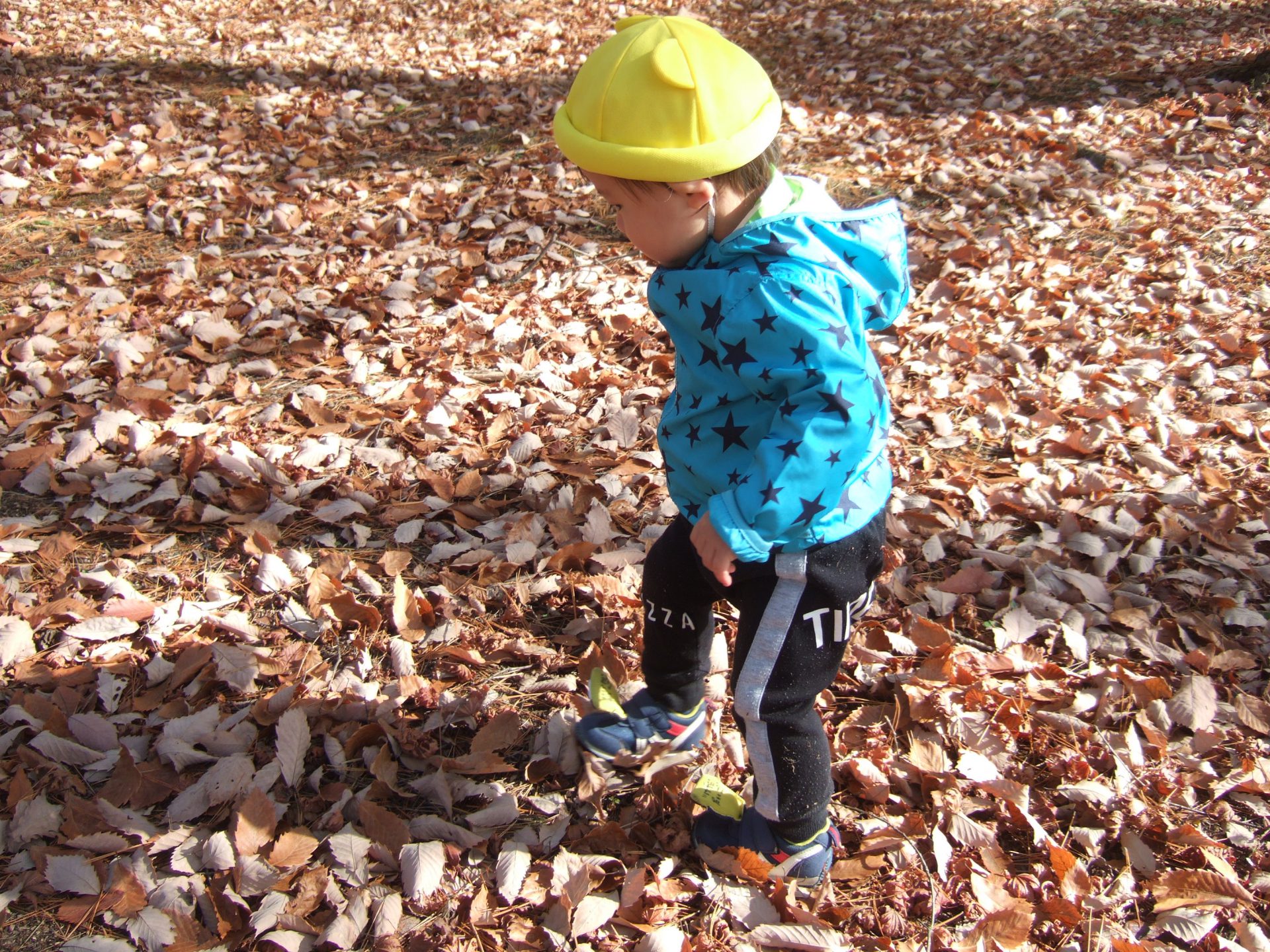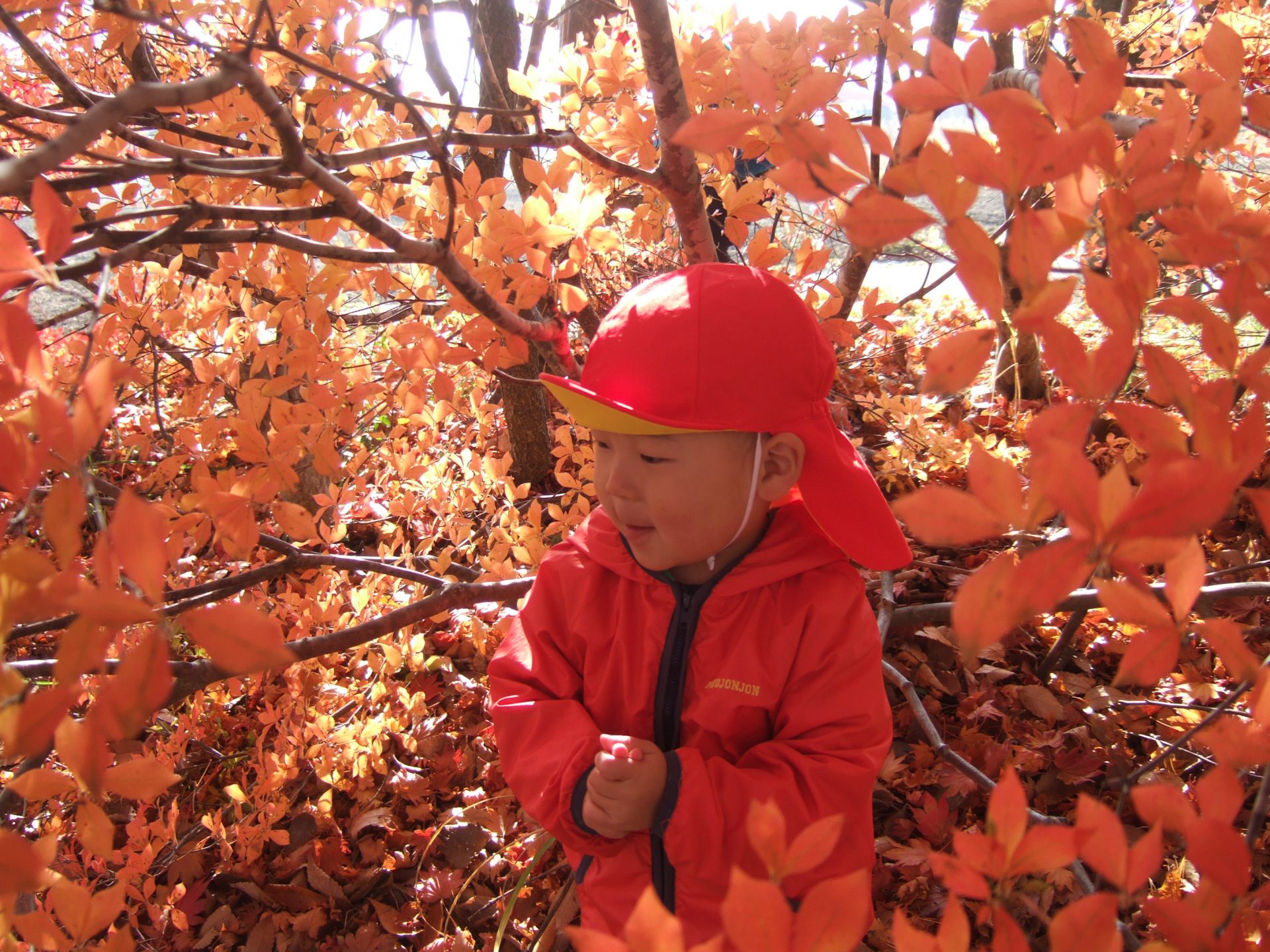 歩行がしっかりしてきて歩くことが楽しいお友達、一面の葉を踏みしめながら進みます。