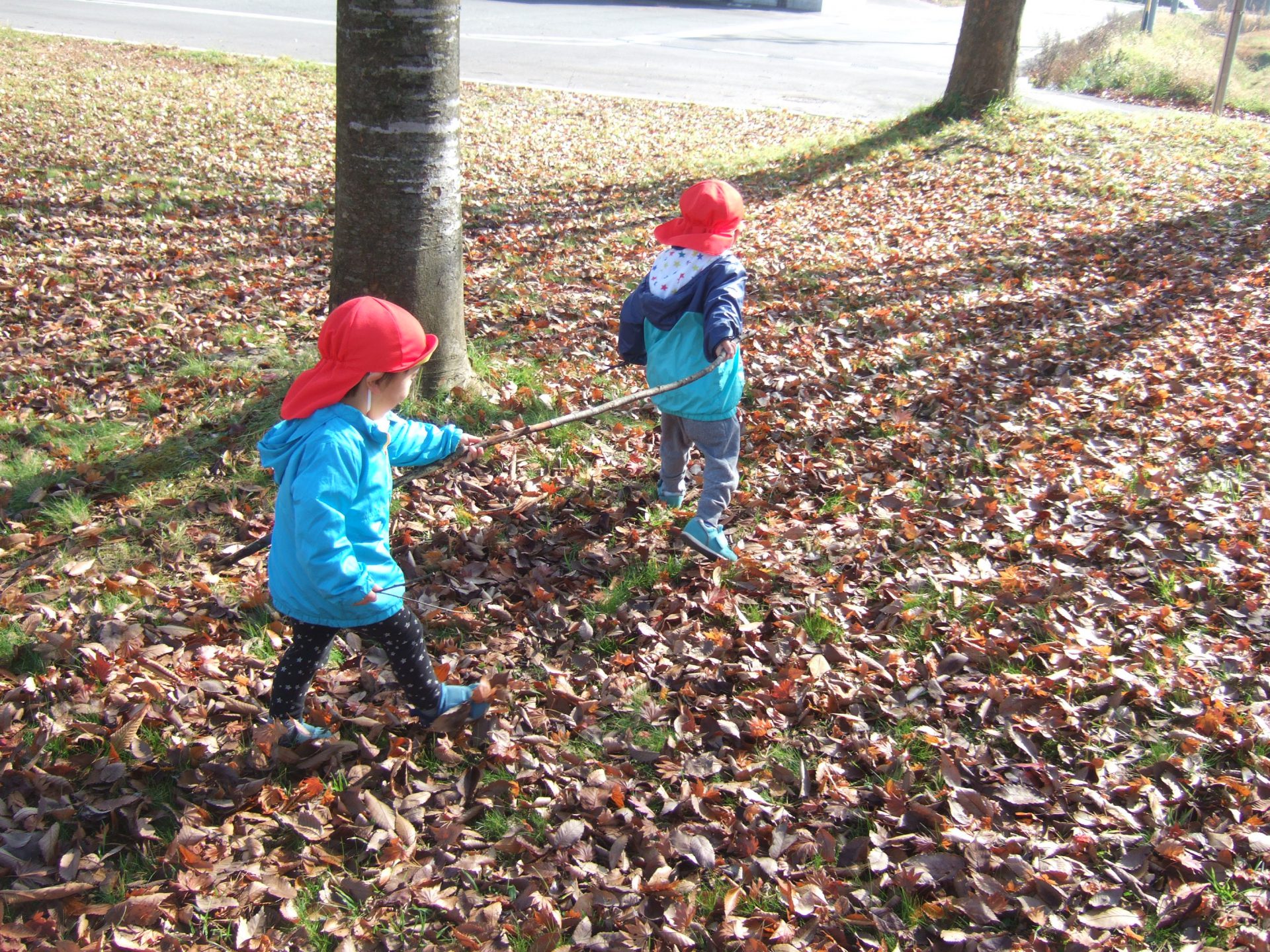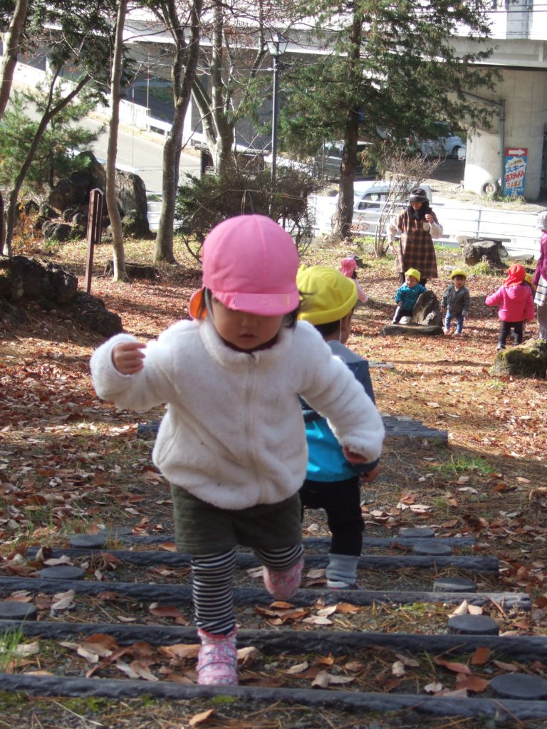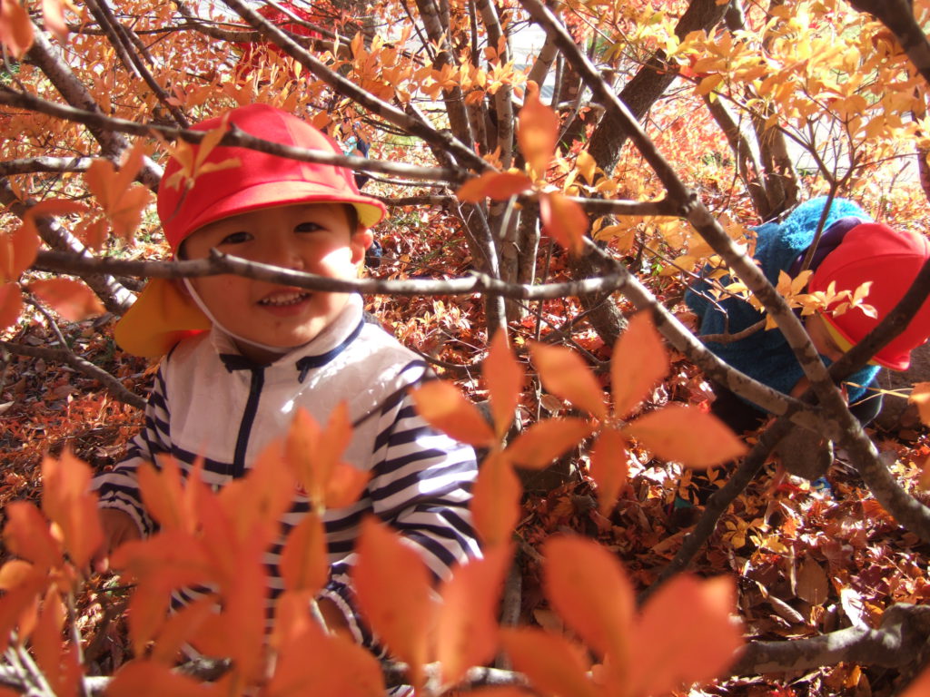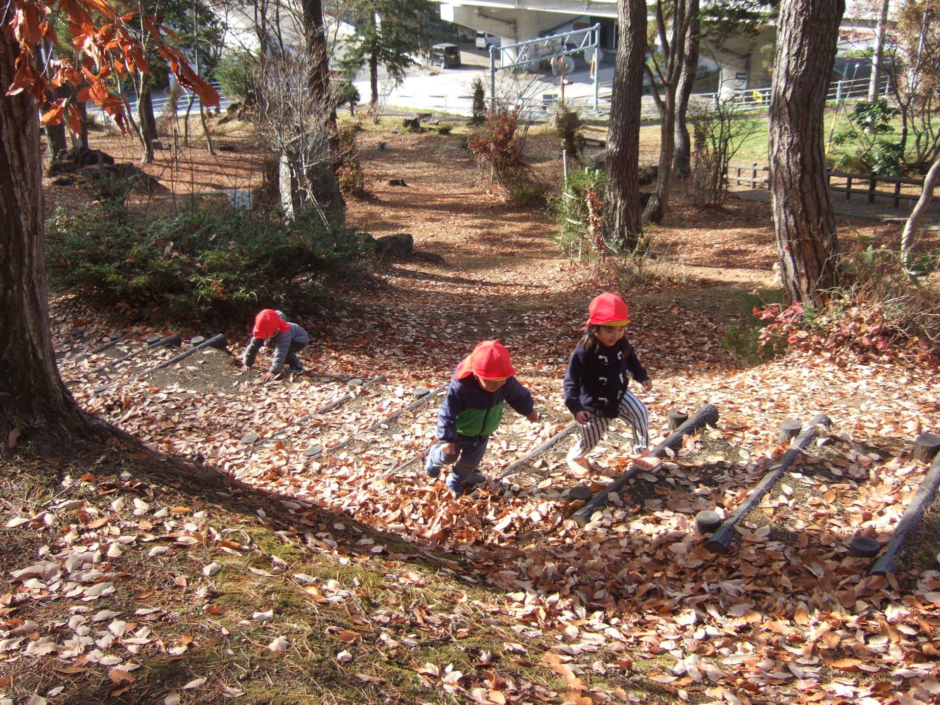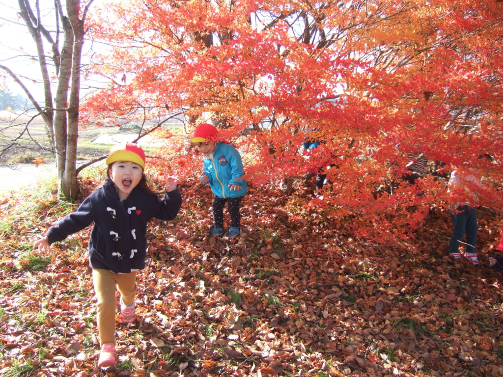 歩行がしっかりしてきて歩くことが楽しいお友達、一面の葉を踏みしめながら進みます。