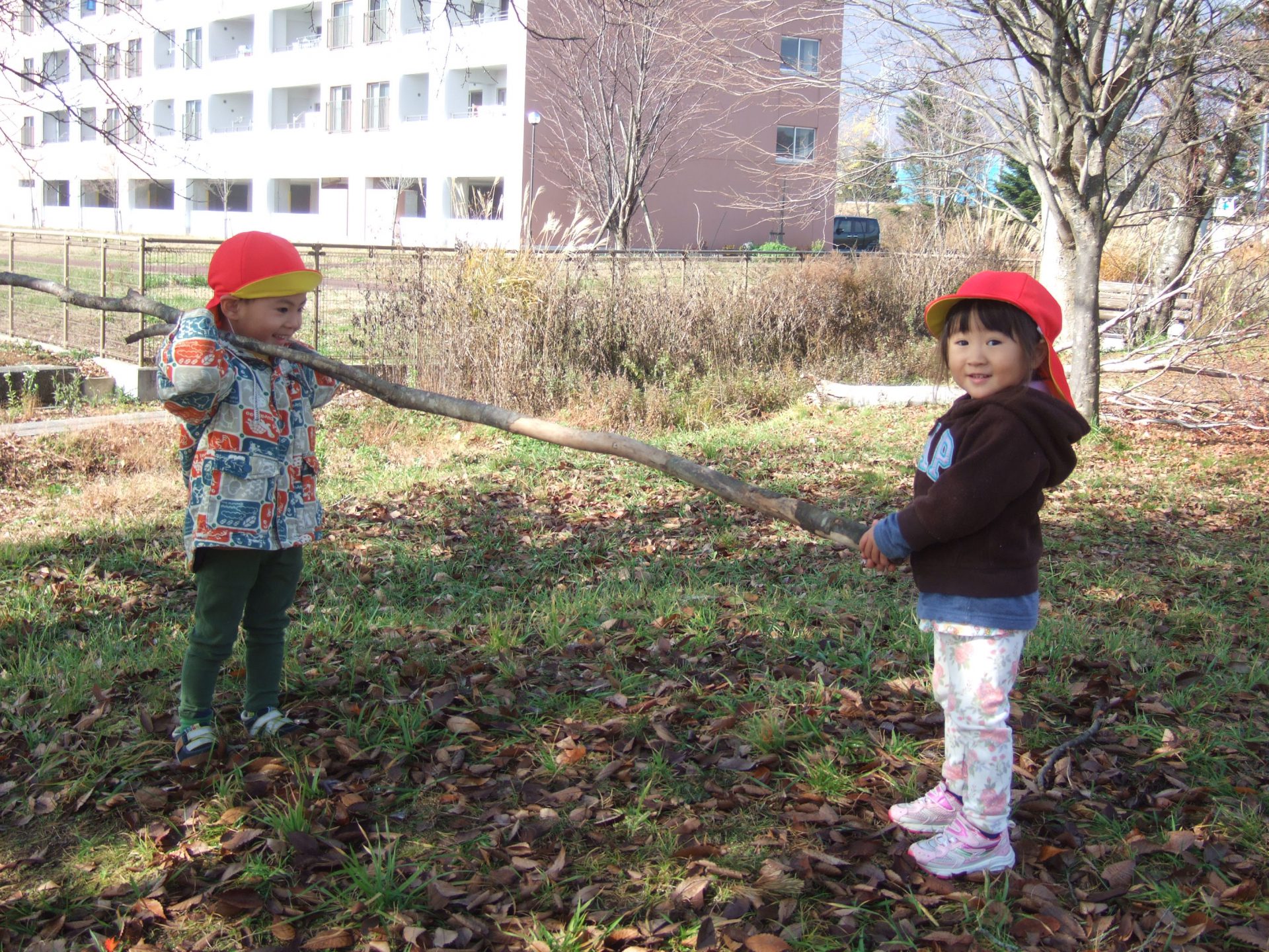 一人では持ち上がらないけど、お友達と一緒なら持てたよ!