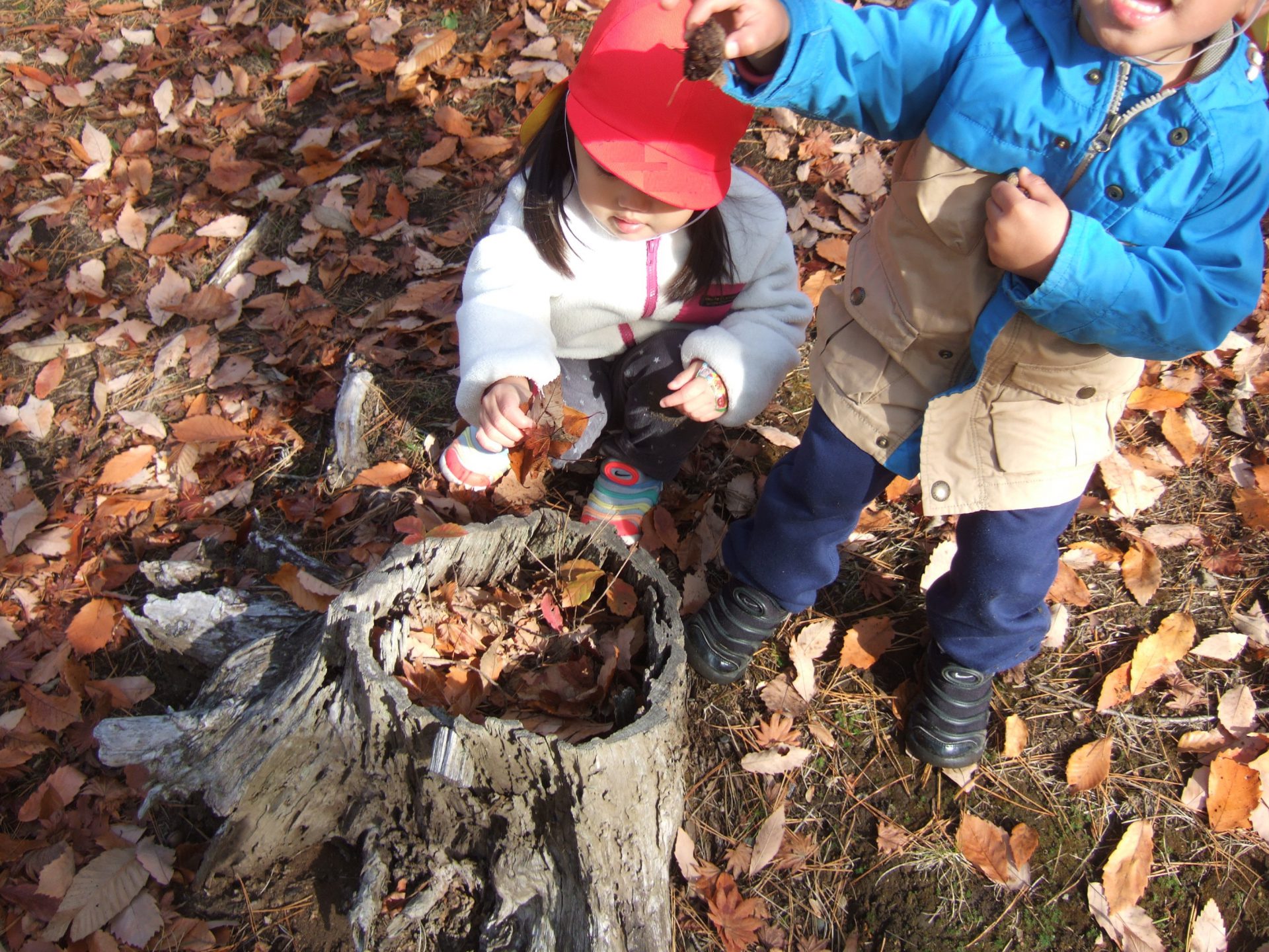 切り株に葉っぱを集めて遊んでいるお友だち。