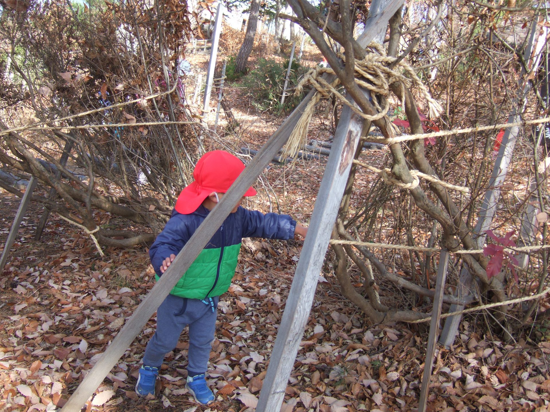 「雪が降って木が折れないように囲うんだよ」とお話すると、じーっと見つめていました。幼いころから見ている風景は子どもの心にしっかり残ると思います。信濃町ならではの景色、覚えていてほしいですね。
