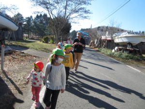 1、2歳さんは、年長さんに手を繋いでもらい、坂道・下り道、細道も頑張って歩いています。回数を重ねたり、距離が伸びていくにつれ、歩くのも上手になってきました!