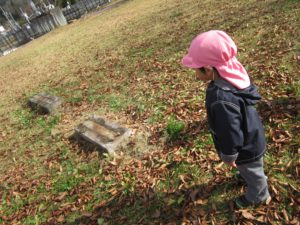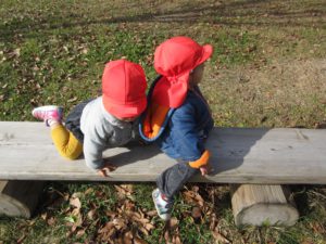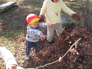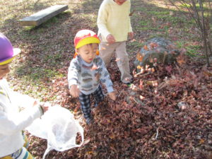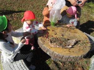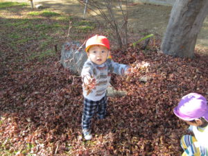 これから冬になり、暖かい中でのお散歩は難しくなってきます。その前に、たくさん散歩に出かけて、体力をつけたり、保育園の周りにある素敵なものたちで遊ぶ経験をしてほしいと思い、晴れた日には、幼児さんたちと一緒にお散歩に行きました。最近は、周りのお友だちをとても意識して、関わりを深める1、2歳児のこどもたちです。幼児さんと一緒にお散歩に行くことで、発見を増やし、一緒にやってみて楽しむ姿がたくさん見られました。