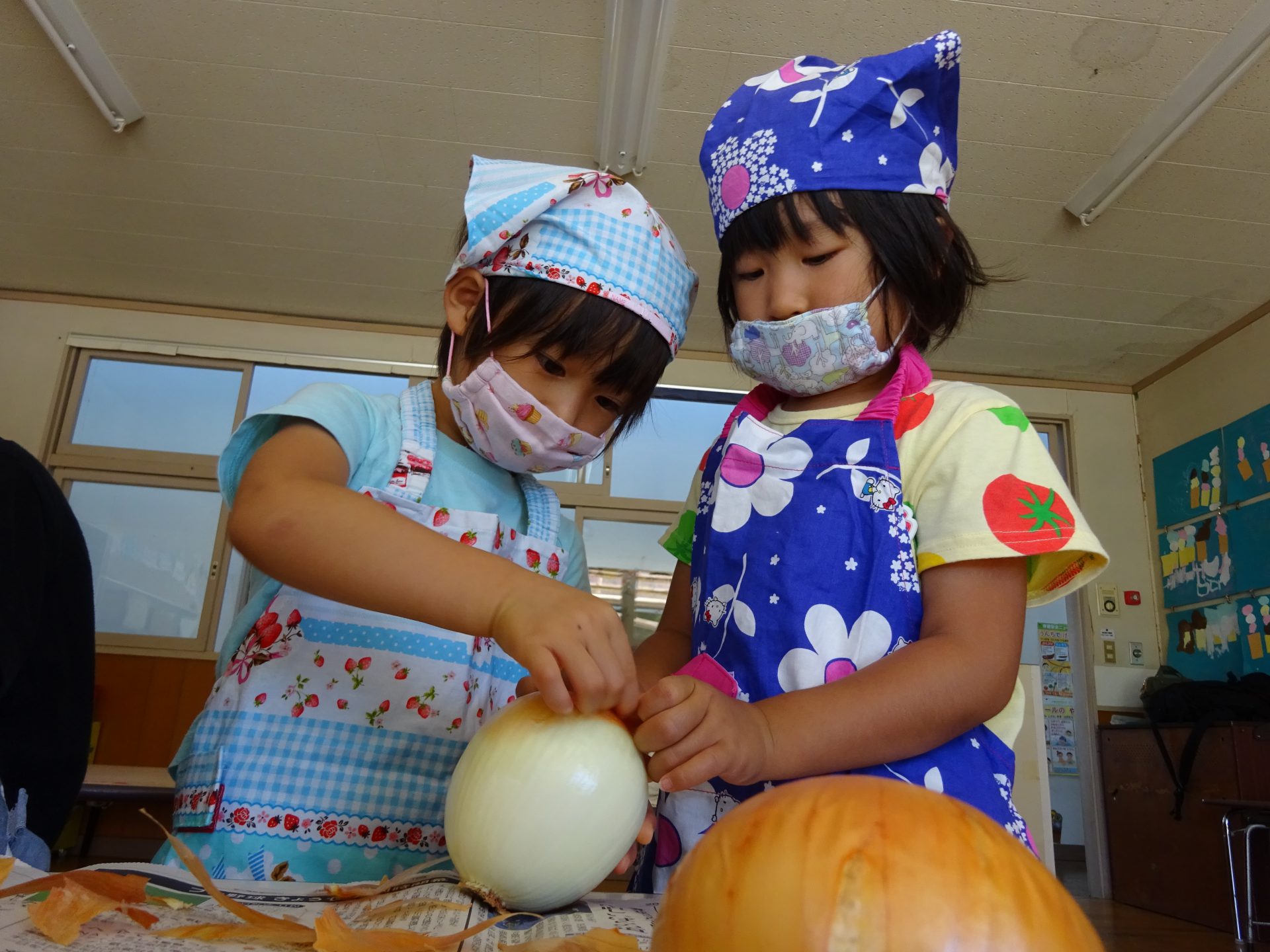 「玉ネギの茶色の皮をむいたら白くなったよ」「なんか目がしみてきた」