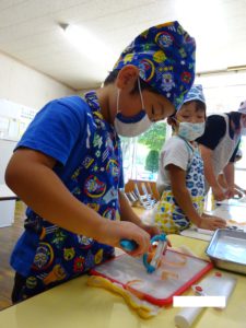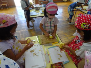 5歳児・・・じゃが芋、玉ねぎ、なす、かぼちゃ、オクラを切る。