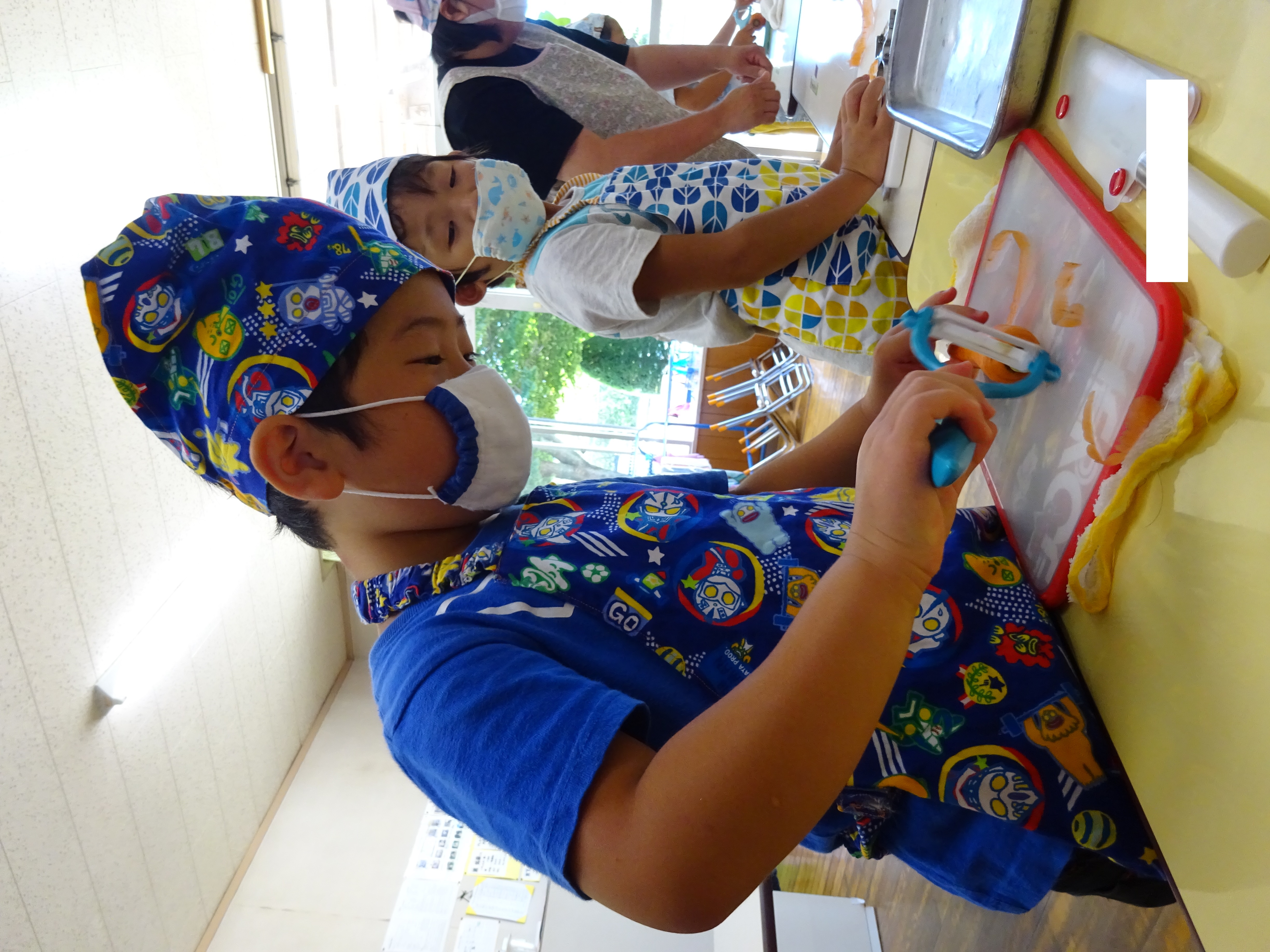 「人参のまるいところはこうすると皮がうまくむけるよ」「○○くんじょうずだな~」