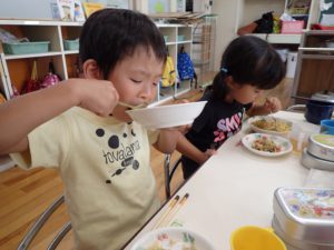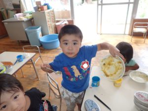 自分達で育てて収穫したじゃが芋や夏野菜を使って皆で調理したカレーは格別においしかったようで完食できました。この喜びがこれからも”食”への興味関心へとつながっていってほしいと思います。