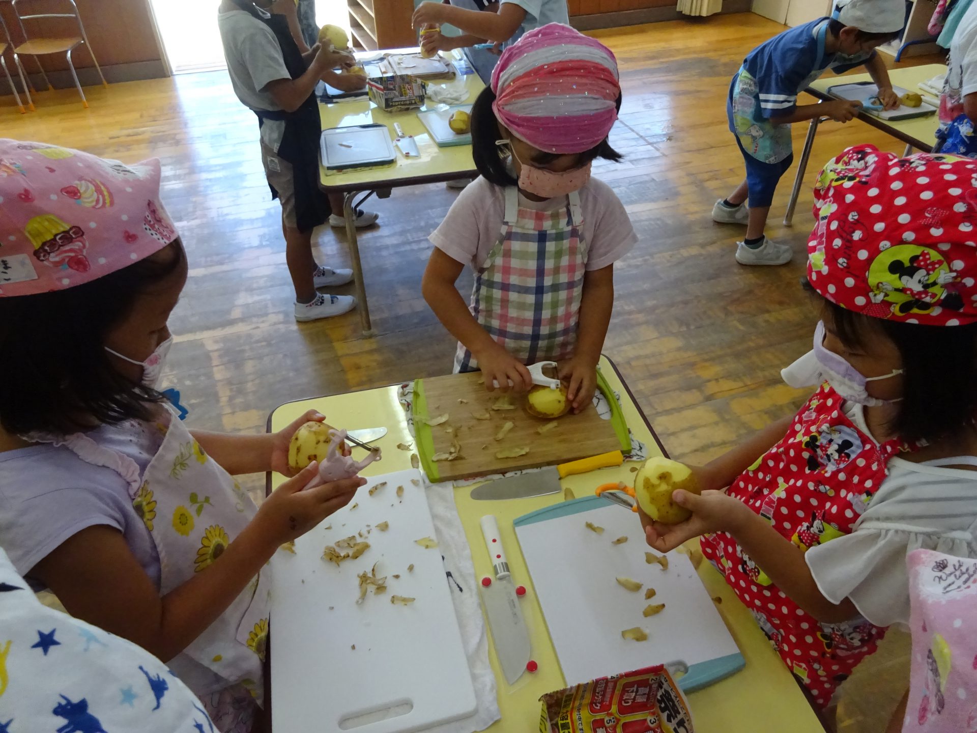 「みんなで掘ったジャガイモだ」「まるい形は手に持ってむくとやりやすいね」