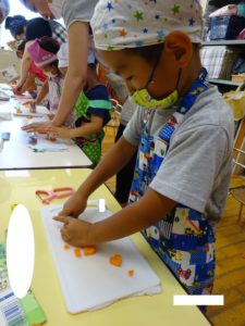様々な野菜を切った年長組は、野菜によって硬さや匂い、切った断面が違うことい気づき友だちと楽しみながら調理ができました。