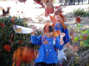 5歳児 身近な秋の自然に触れ、様々な発見をする中で親しみ、ともだちと発展させて遊びにひたりこんで欲しい。