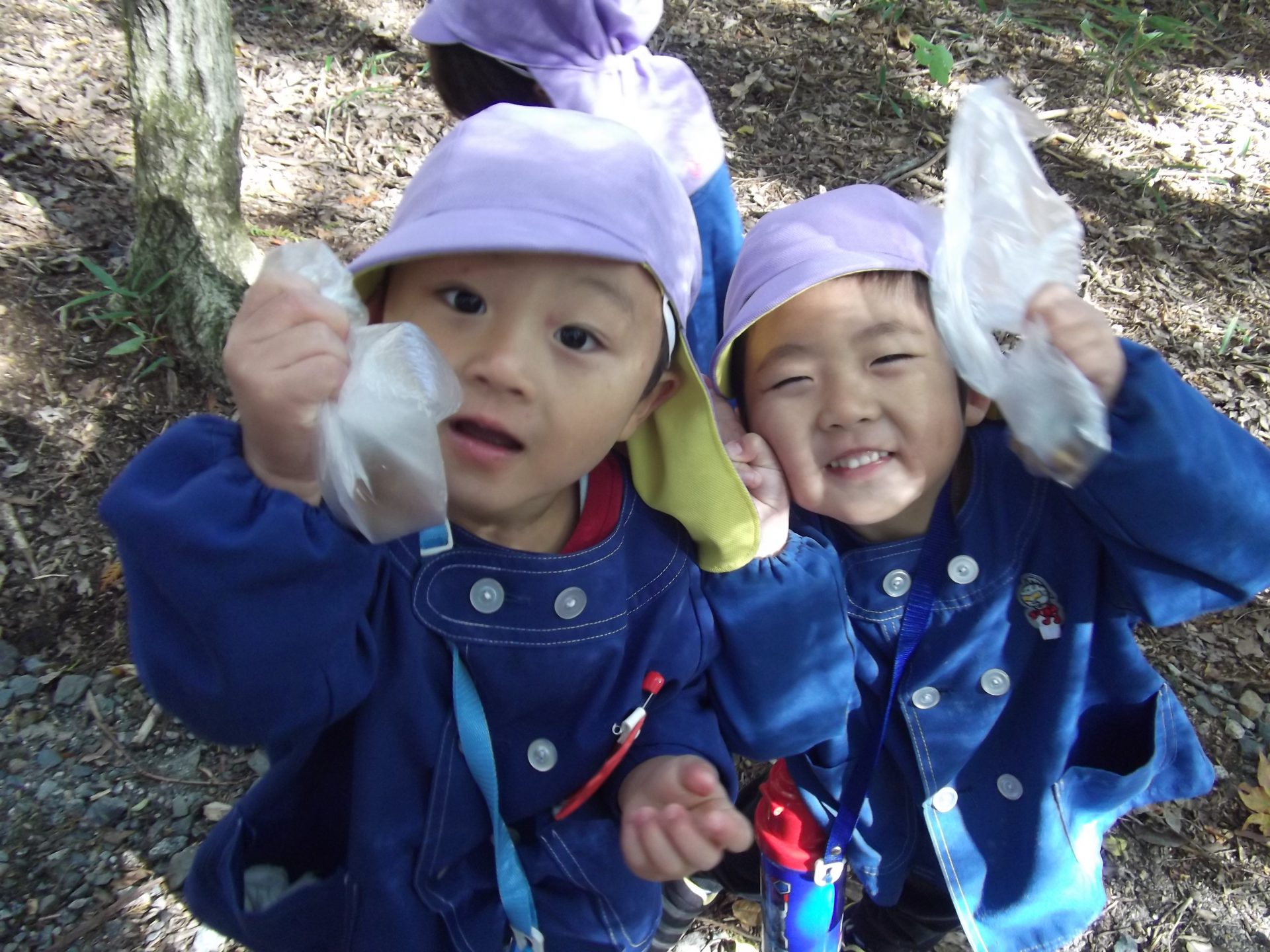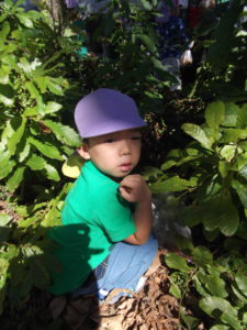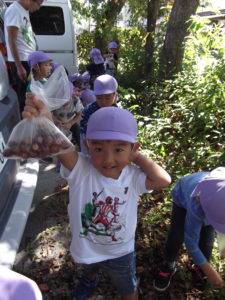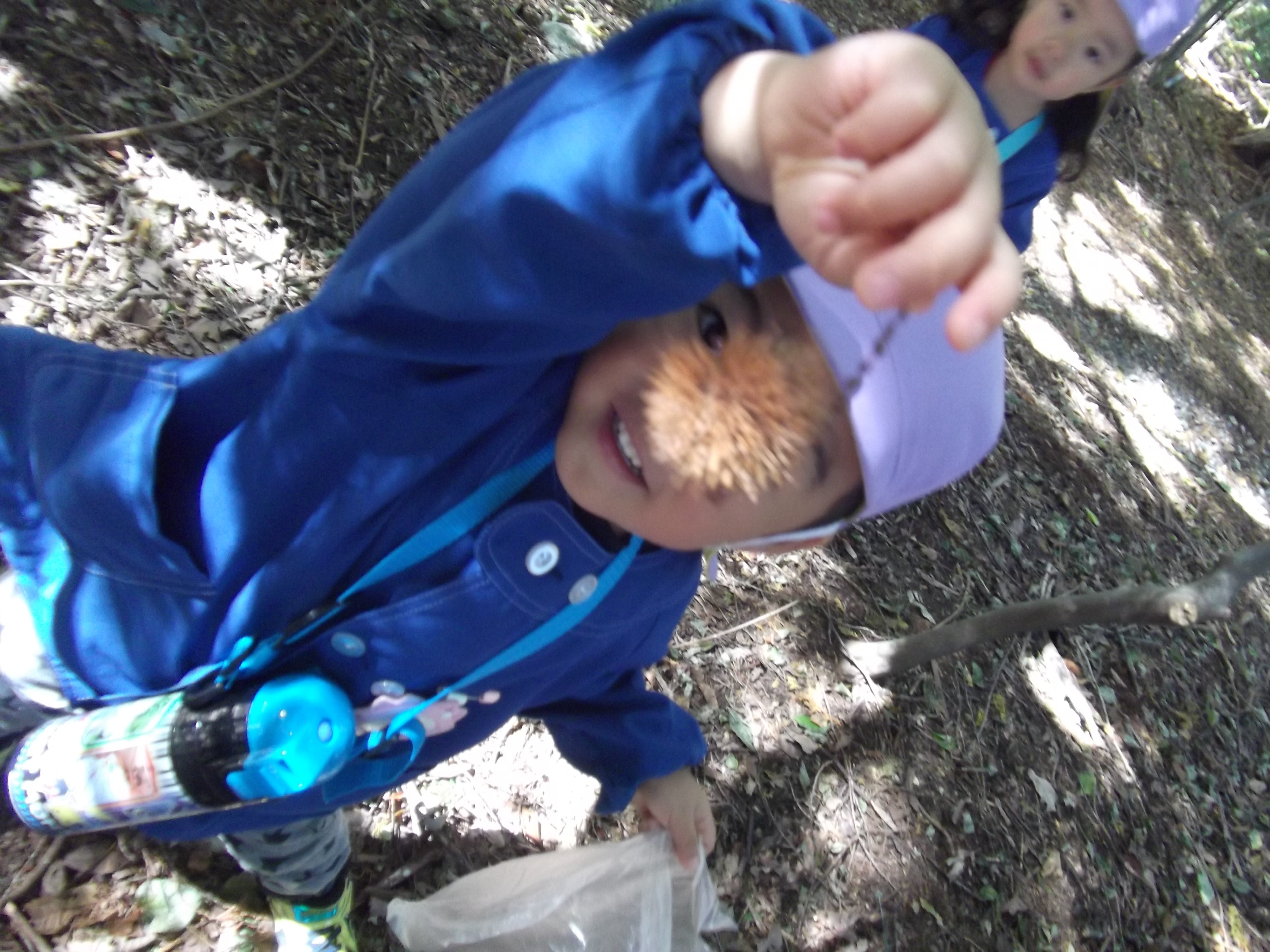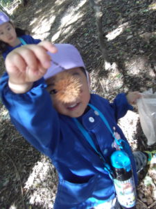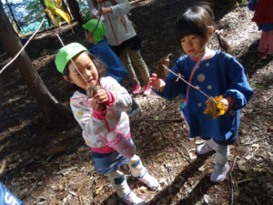 お散歩に出かけて、虫や木の実を見つけたり、森の中で色々な発見をしたりしました。園庭でも自然物を使っての遊びを楽しんでいます。