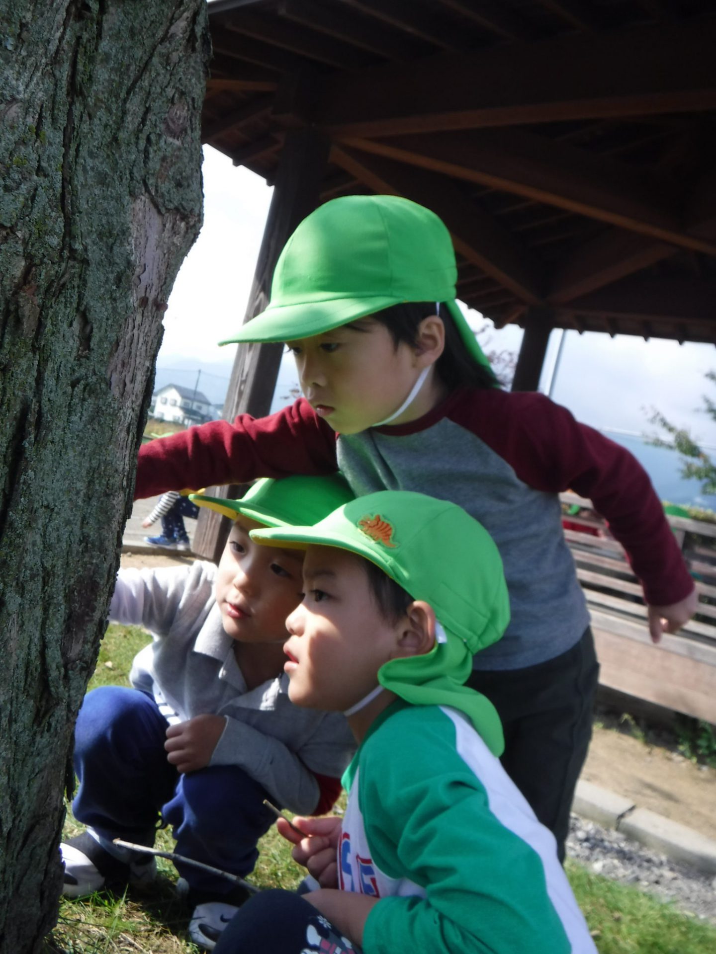 「木の皮の中に虫がいるかもしれないよ」「夏の時より虫がいなくなったよね」