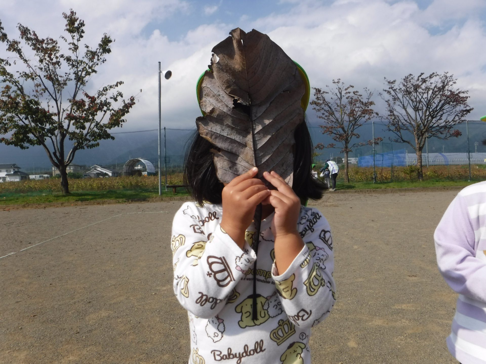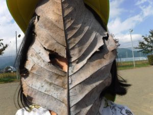「お面みたいでしょ??」と葉に穴があいていてそこからのぞいて