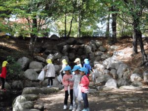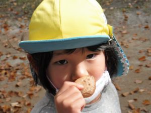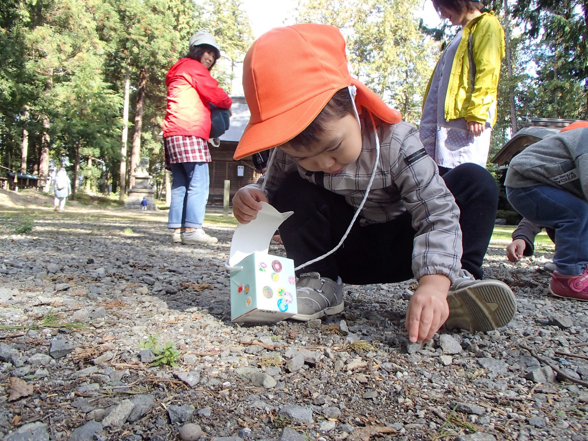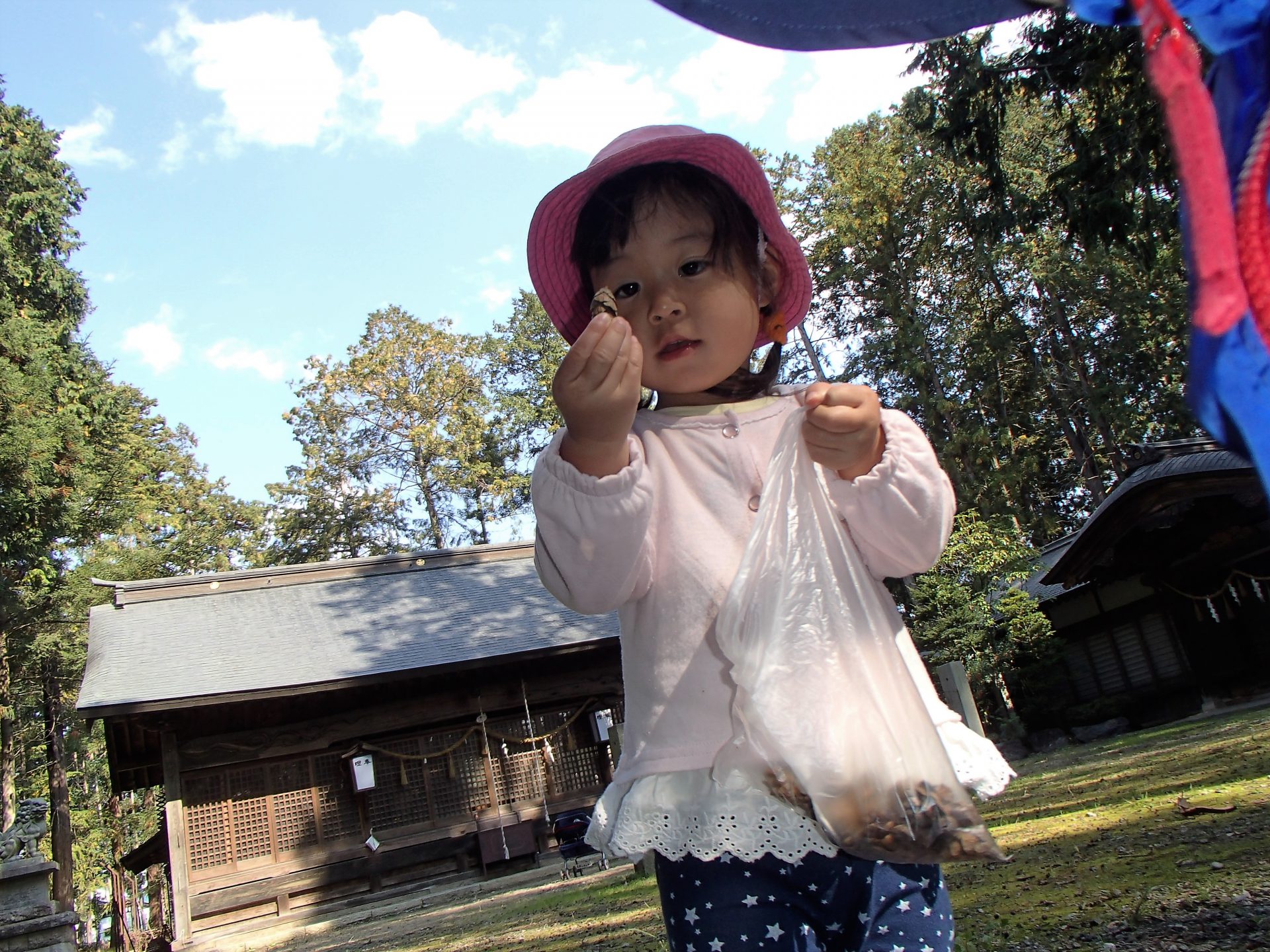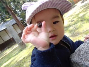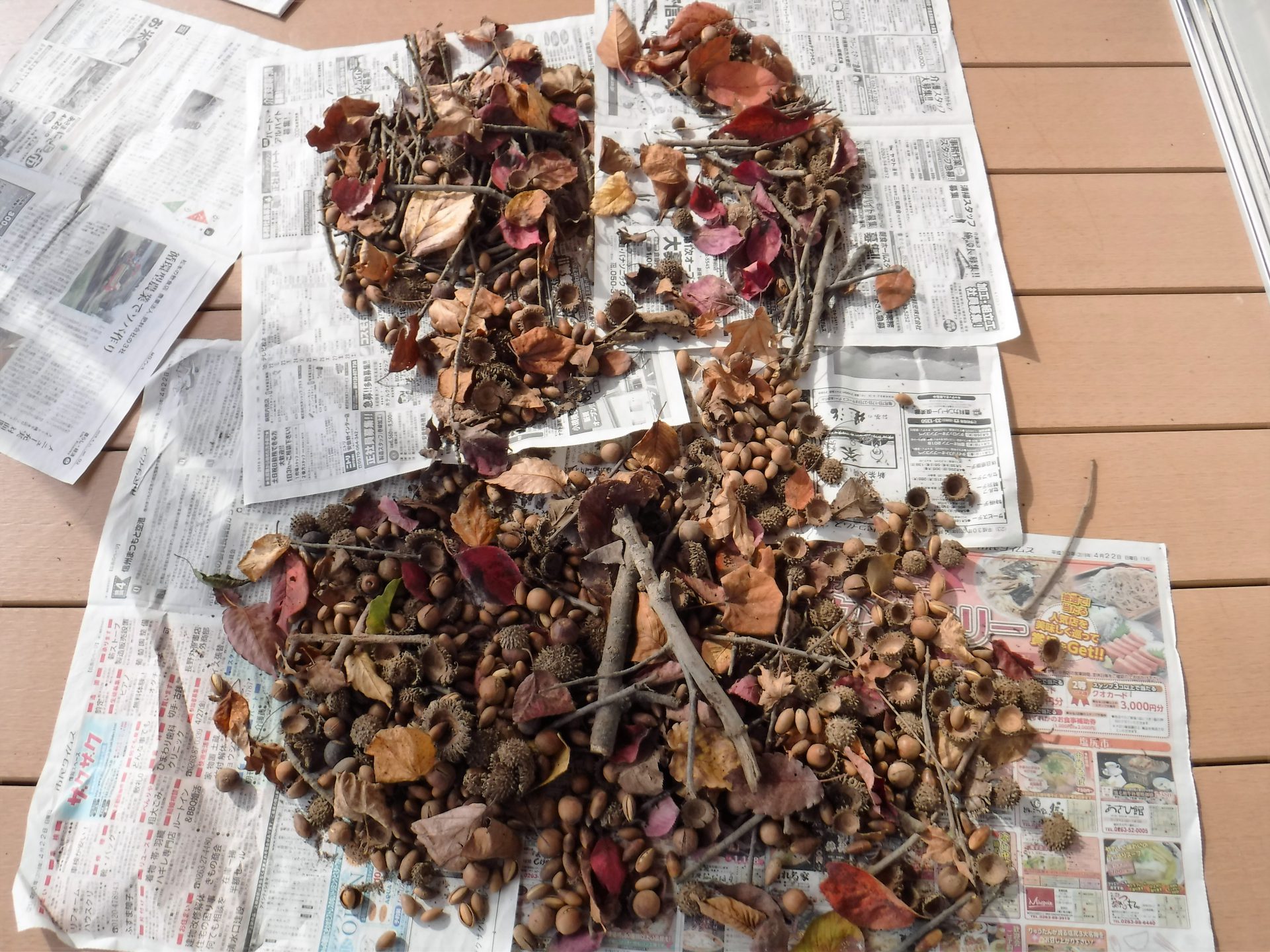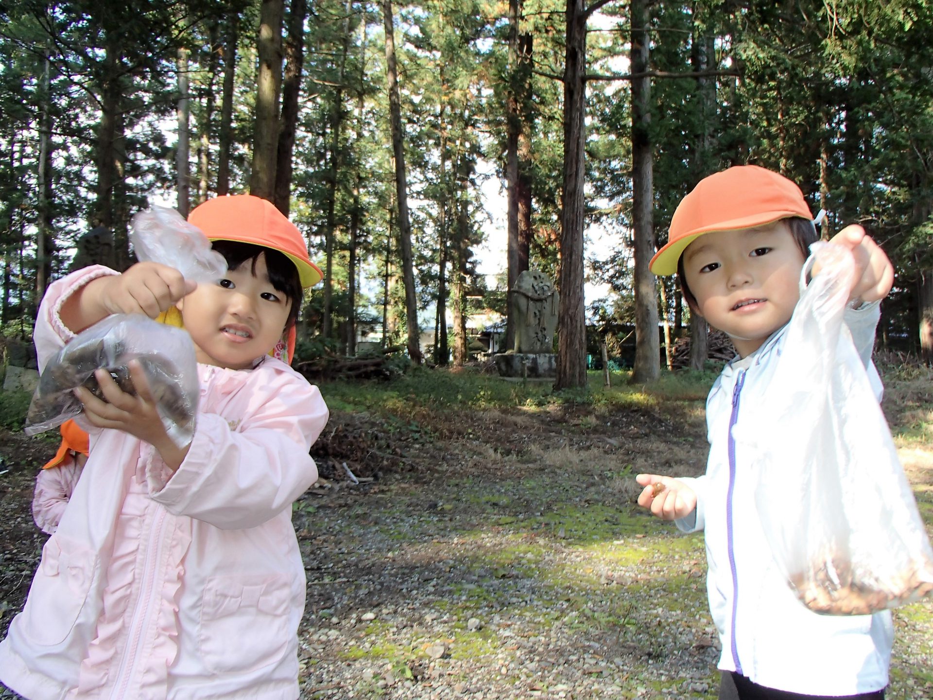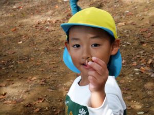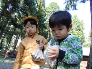 近くの神社にたくさん木の実が落ちていて、それを集めに行きました