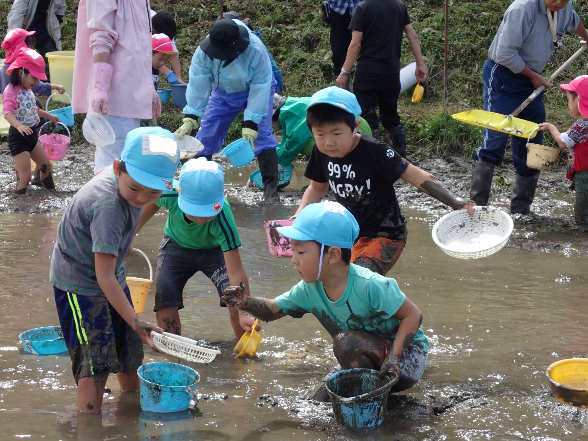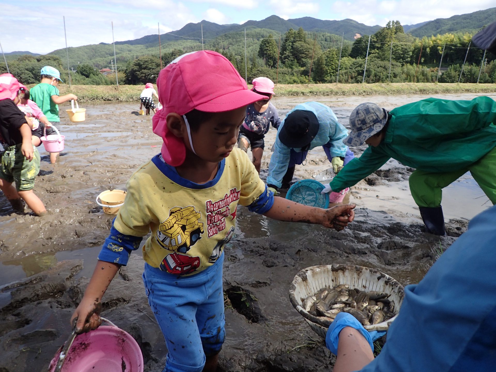 田んぼの中でピチピチと逃げ回るフナ。友達同士でどうすれば捕えることができるのか考え、「静かに近づく」「挟みうちにする」など工夫する子どもの姿がありました。