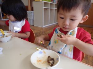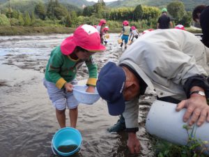 食農教育の中で植物の栽培、収穫、調理体験は生活の中で身近にできるが、生物での体験は難しい。毎年、地域の方のお誘いで、ふな捕りの体験をさせていただき、その2~3日後には煮つけて給食でいただいている。