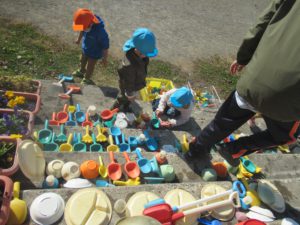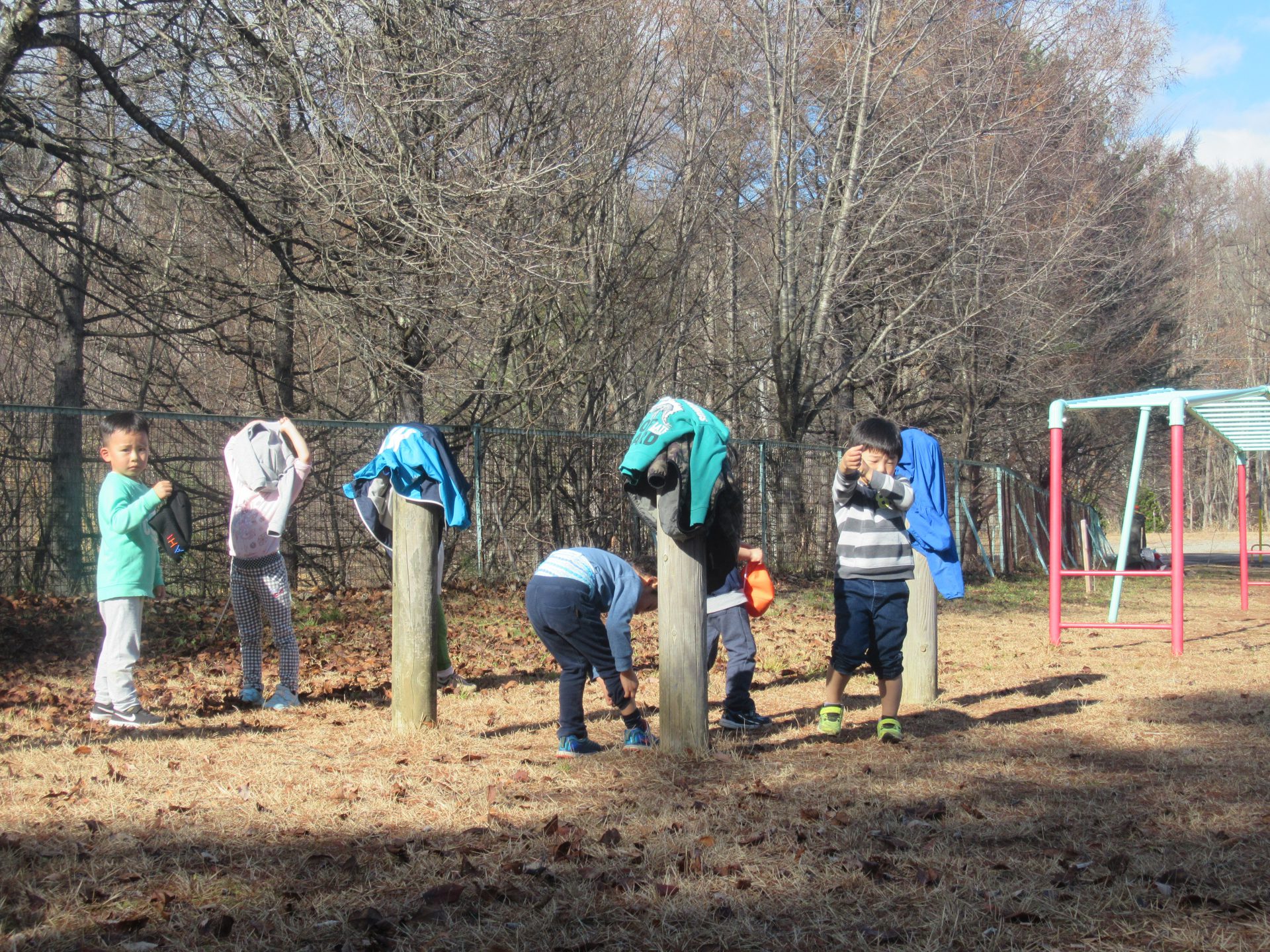 そのうちに・・・「あっつーい!!」と帽子や上着、長袖も脱ぎ捨てて遊ぶお友だちが大勢でした。天気や自分の体調に合わせて、脱いだり着たり調節をしていました。
