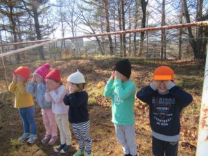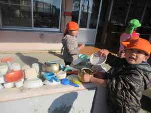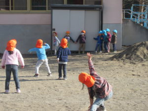 北風にも負けず、お庭やお部屋の中で遊んでいる子どもたち。