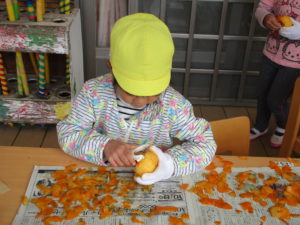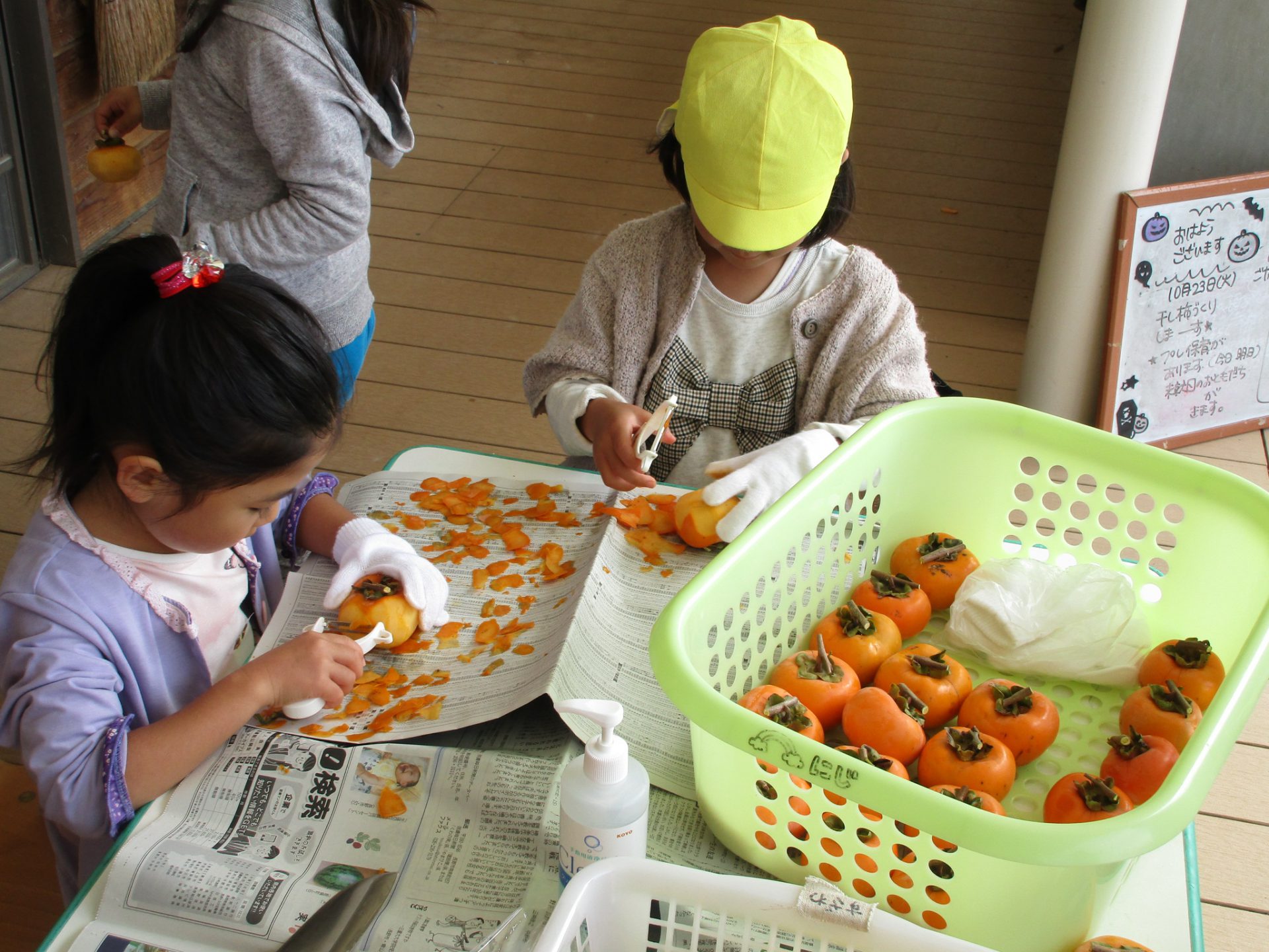 今年はいっぱい柿が実り、子ども達に「あれ食べられる?」と聞かれたり、「あの柿は干し柿にするとおいしいってよ。うちで作ってるもん」と教えてくれたりしたので、早速、干し柿作りをしてみました。
