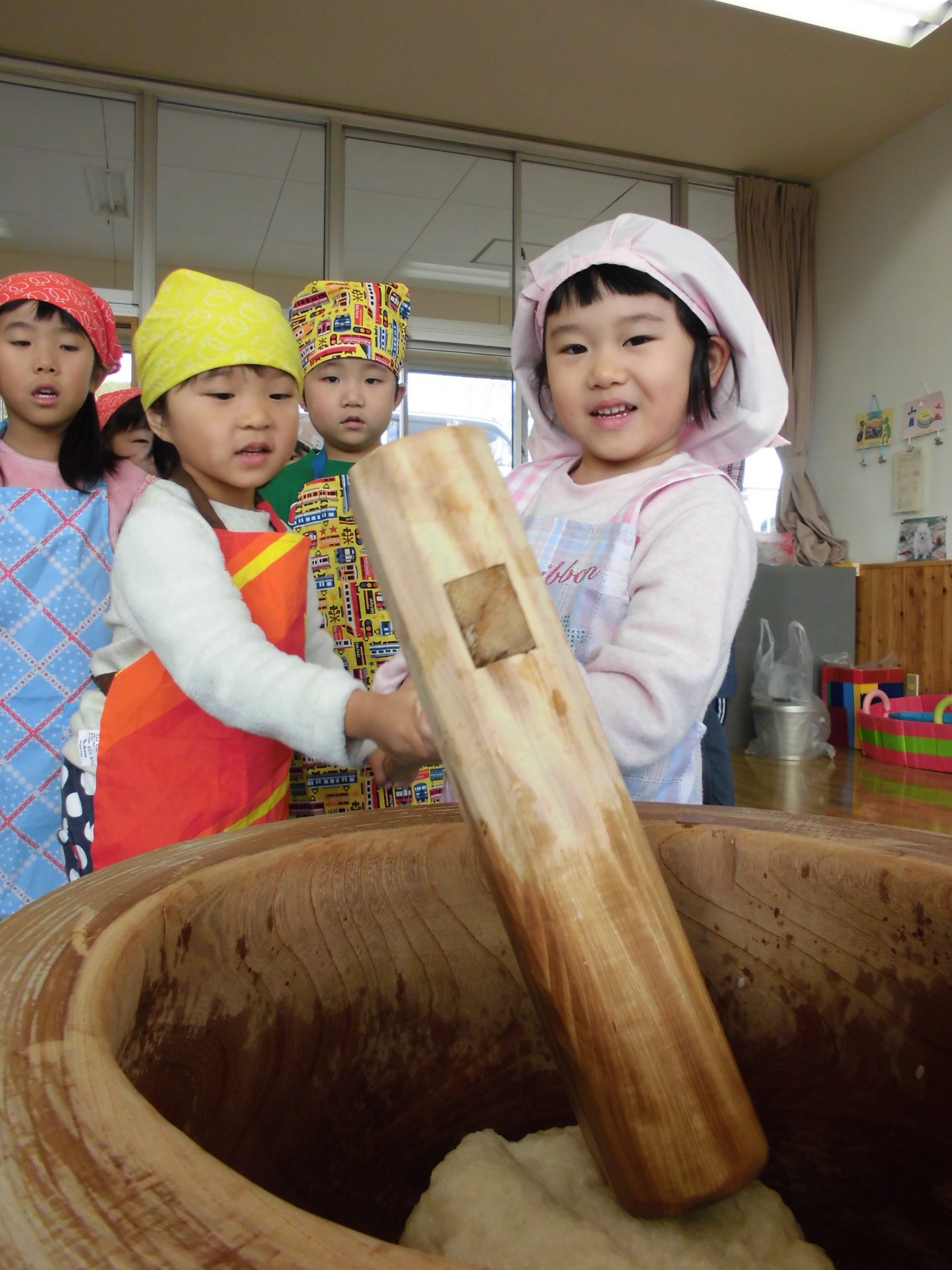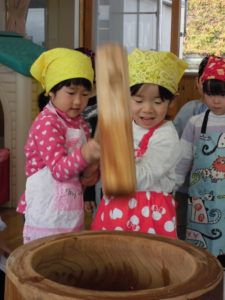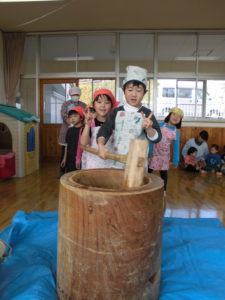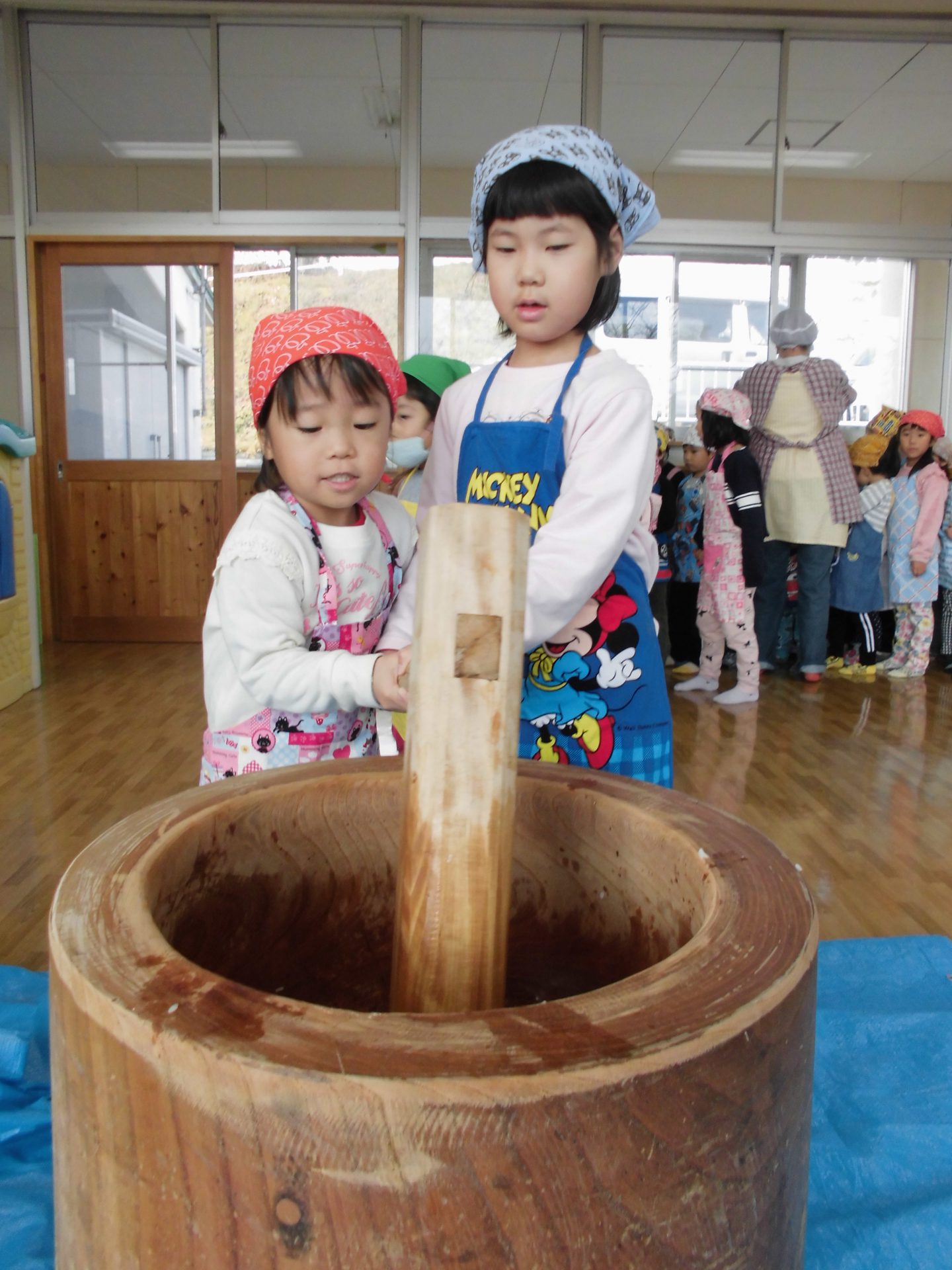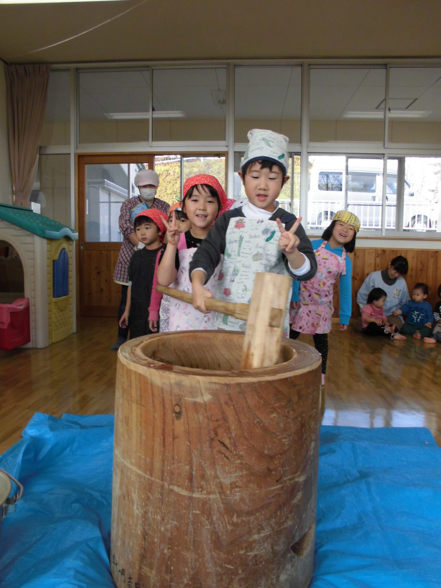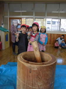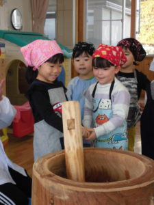 今では見かけることも少なくなってきた杵と臼を使って行います。年少さんは初めて本物を見た子も多いのではないでしょうか。