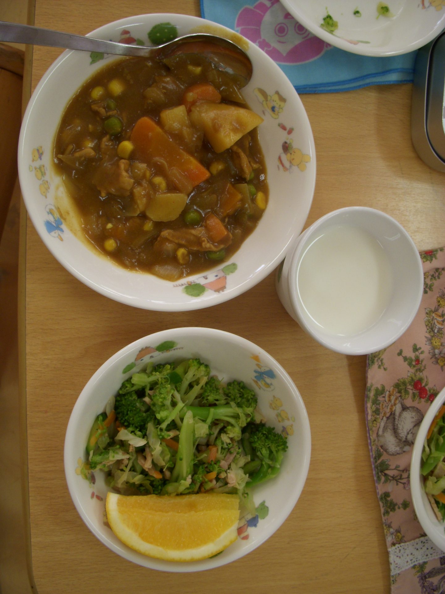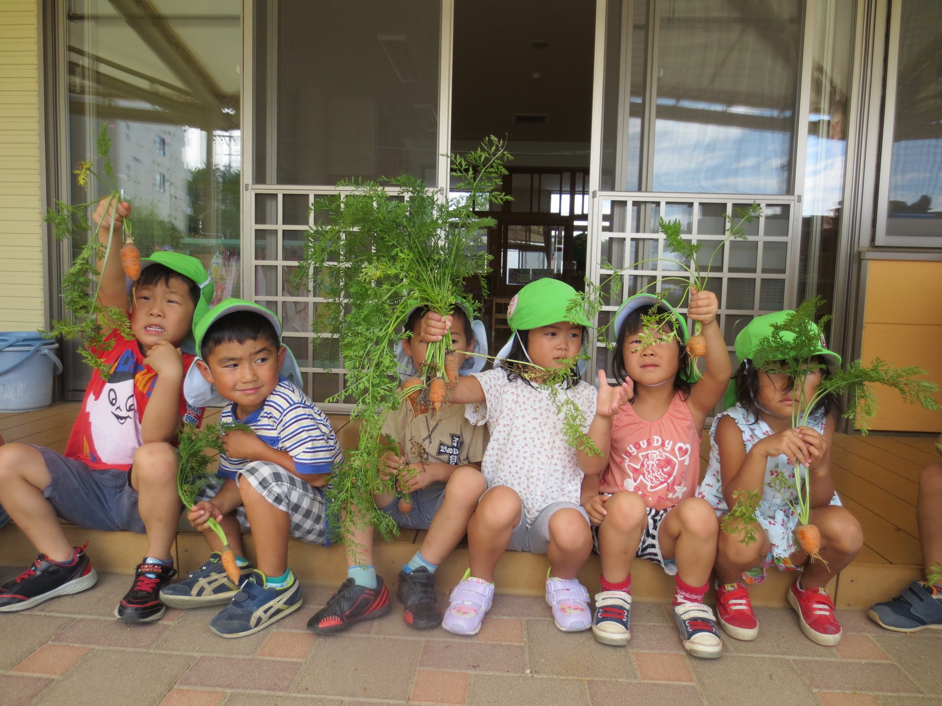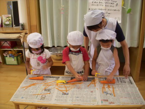 畑で育てた野菜の収穫を喜び、自分達で皮を剥いたり切ったりする体験をとおして、にんじんやじゃがいもの感触や匂いを感じ野菜に興味関心を持って欲しいと思います。