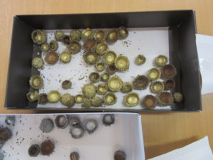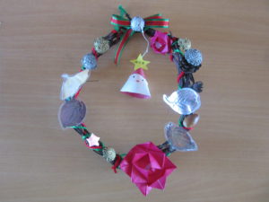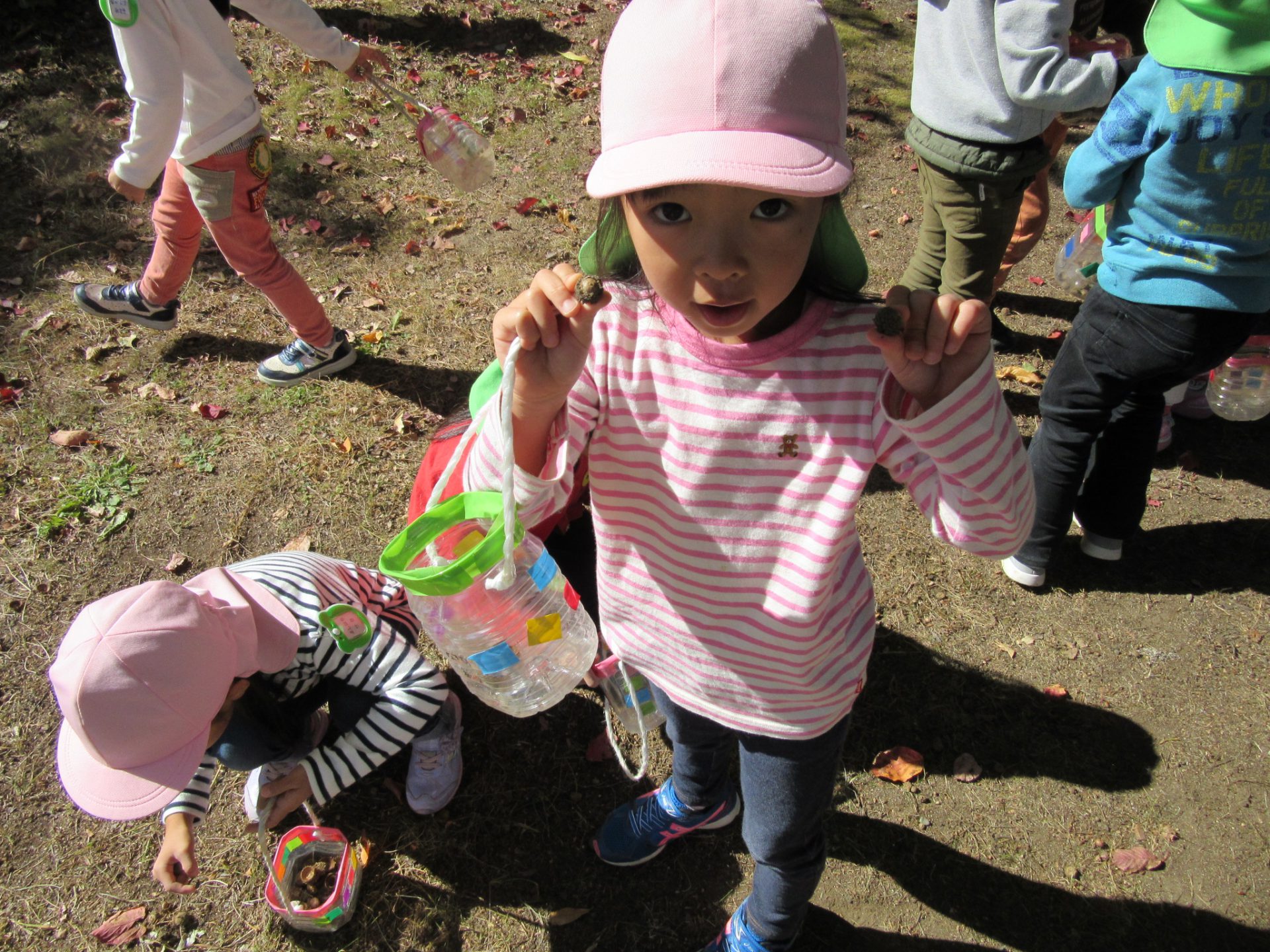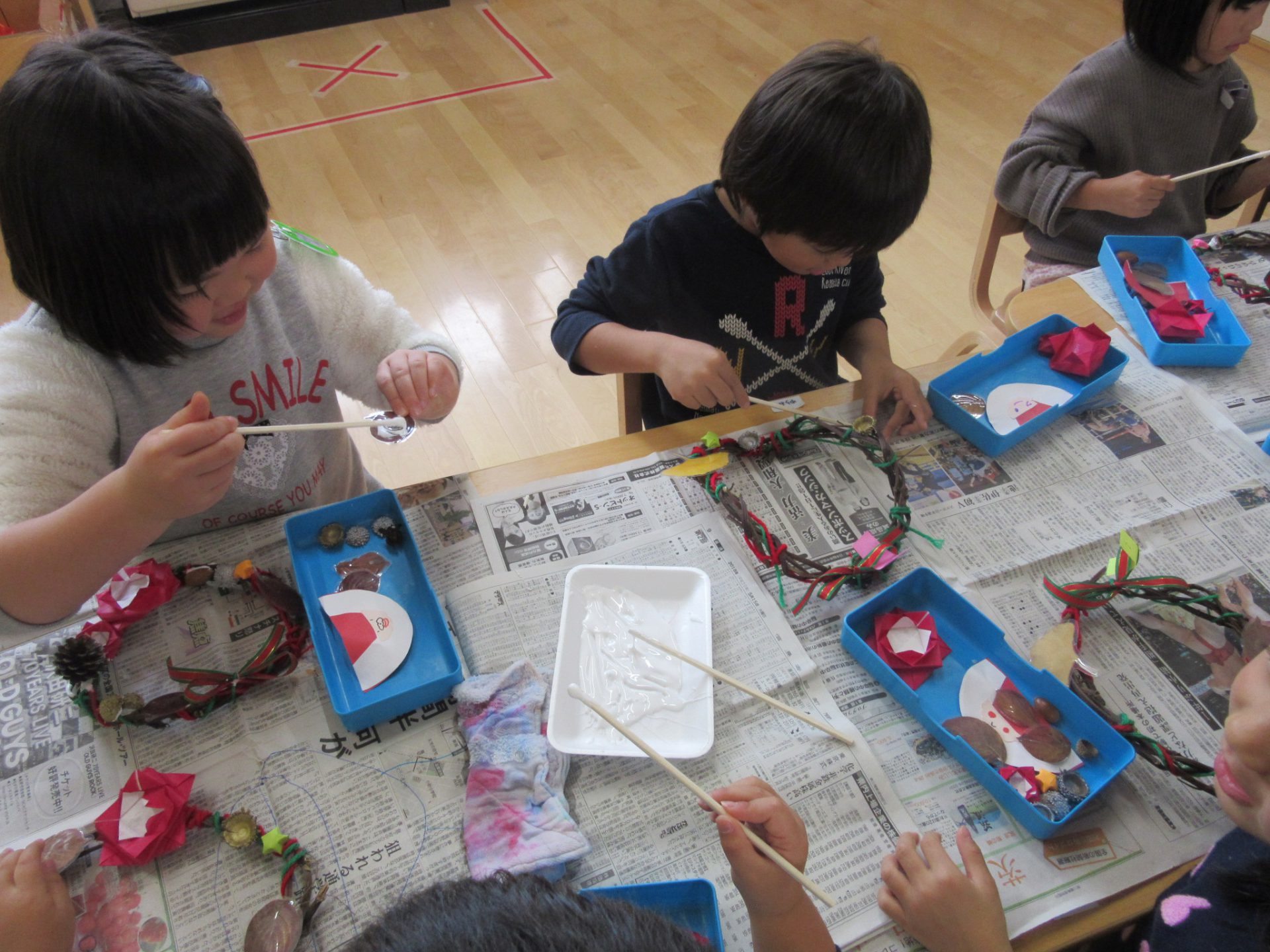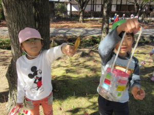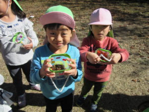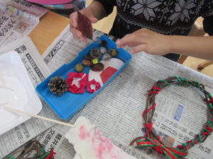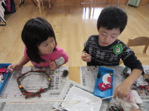 リース作りでは、素材の違いを確認しながら「どんぐり帽子は、どんぐりにかぶせてあげよう。」「落ち葉をつなげてリボンにしてみよう。」など、発想を豊かに膨らめ、作ることを楽しんでいた子ども達でした。