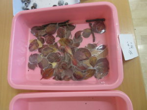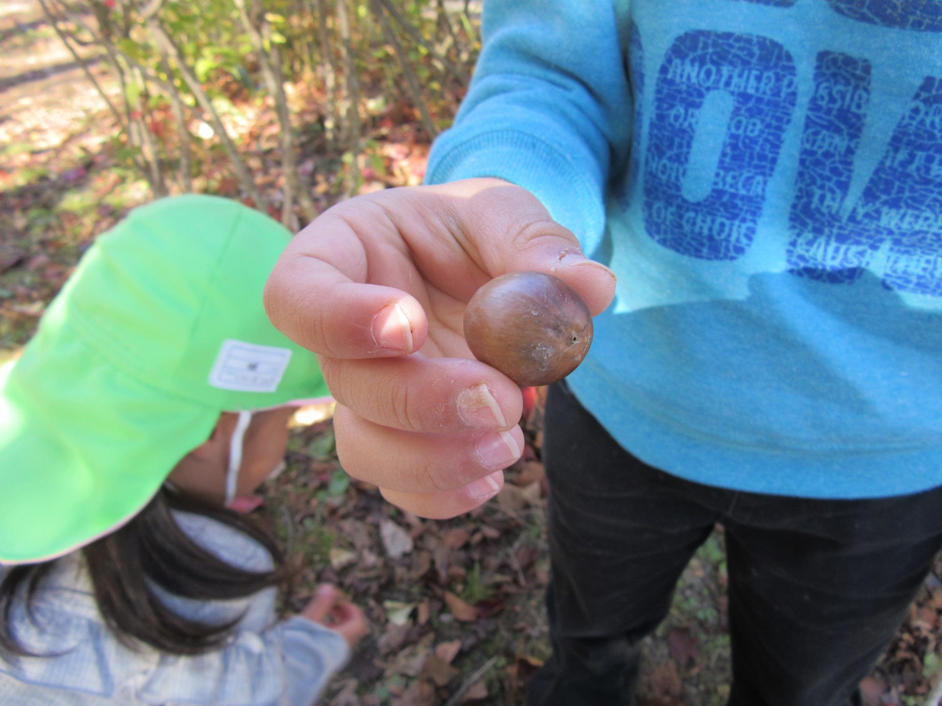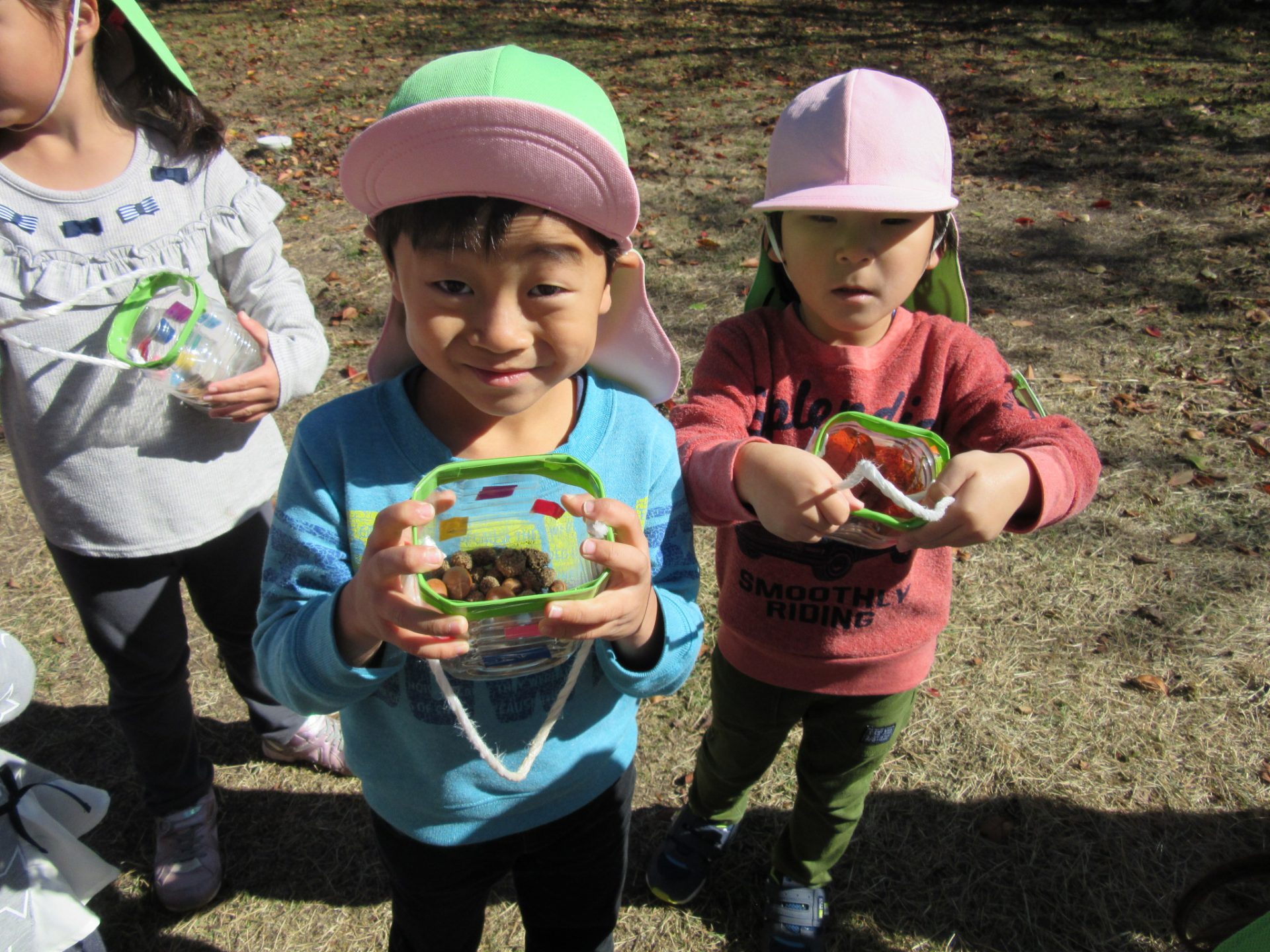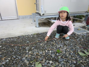 散歩先では、様々な自然物を発見することができました。見つけた自然物をさらによく見てみると、一つひとつが色も形も大きさも違うことに気付いた子ども達でした。また、自然から生み出された独特の色や形の美しさや温かさも感じることができました。