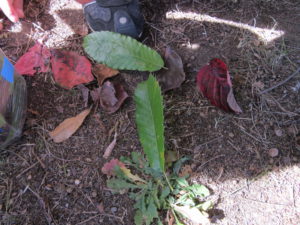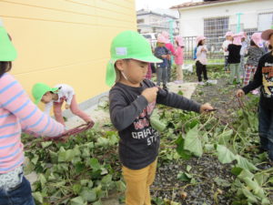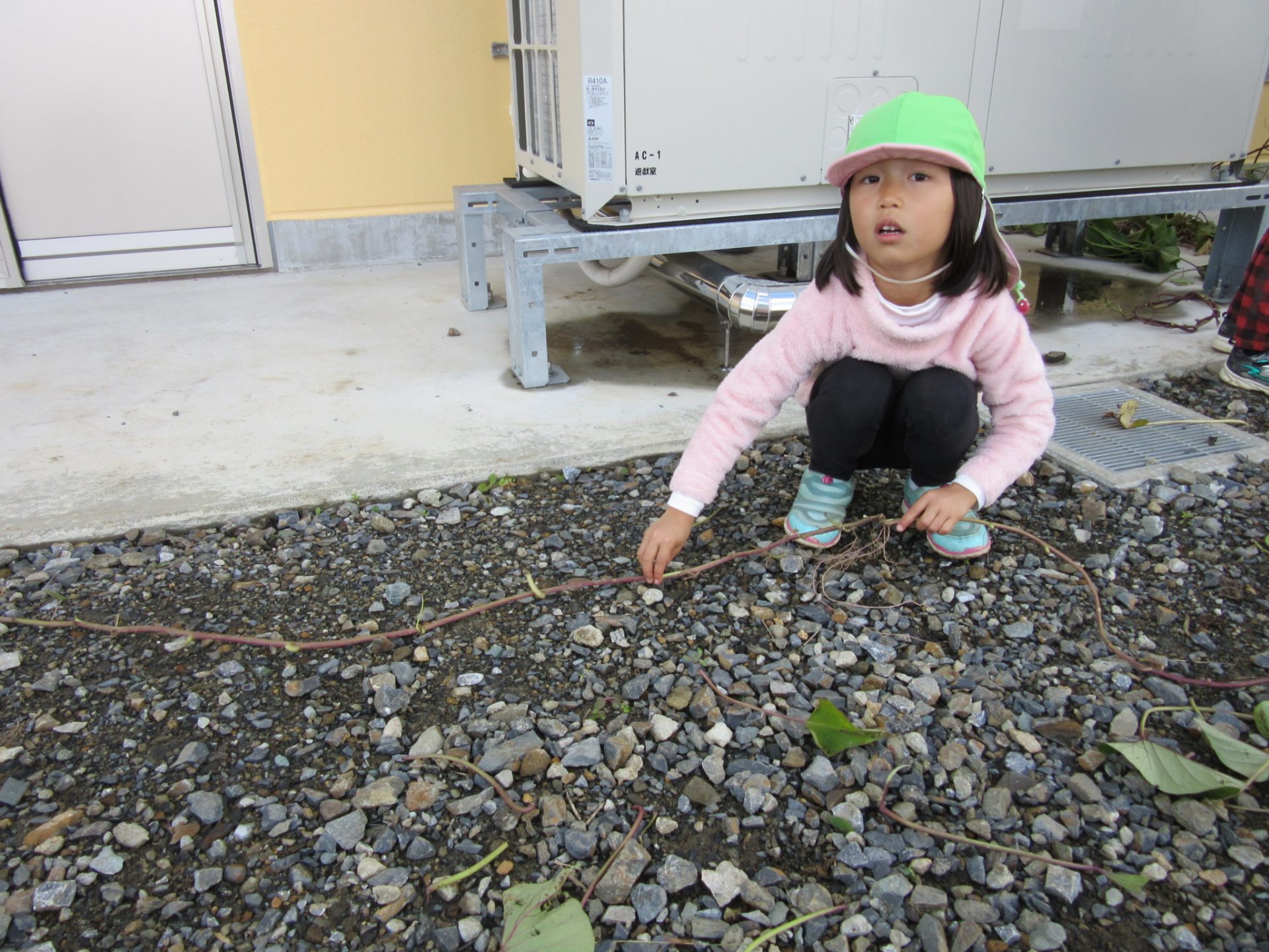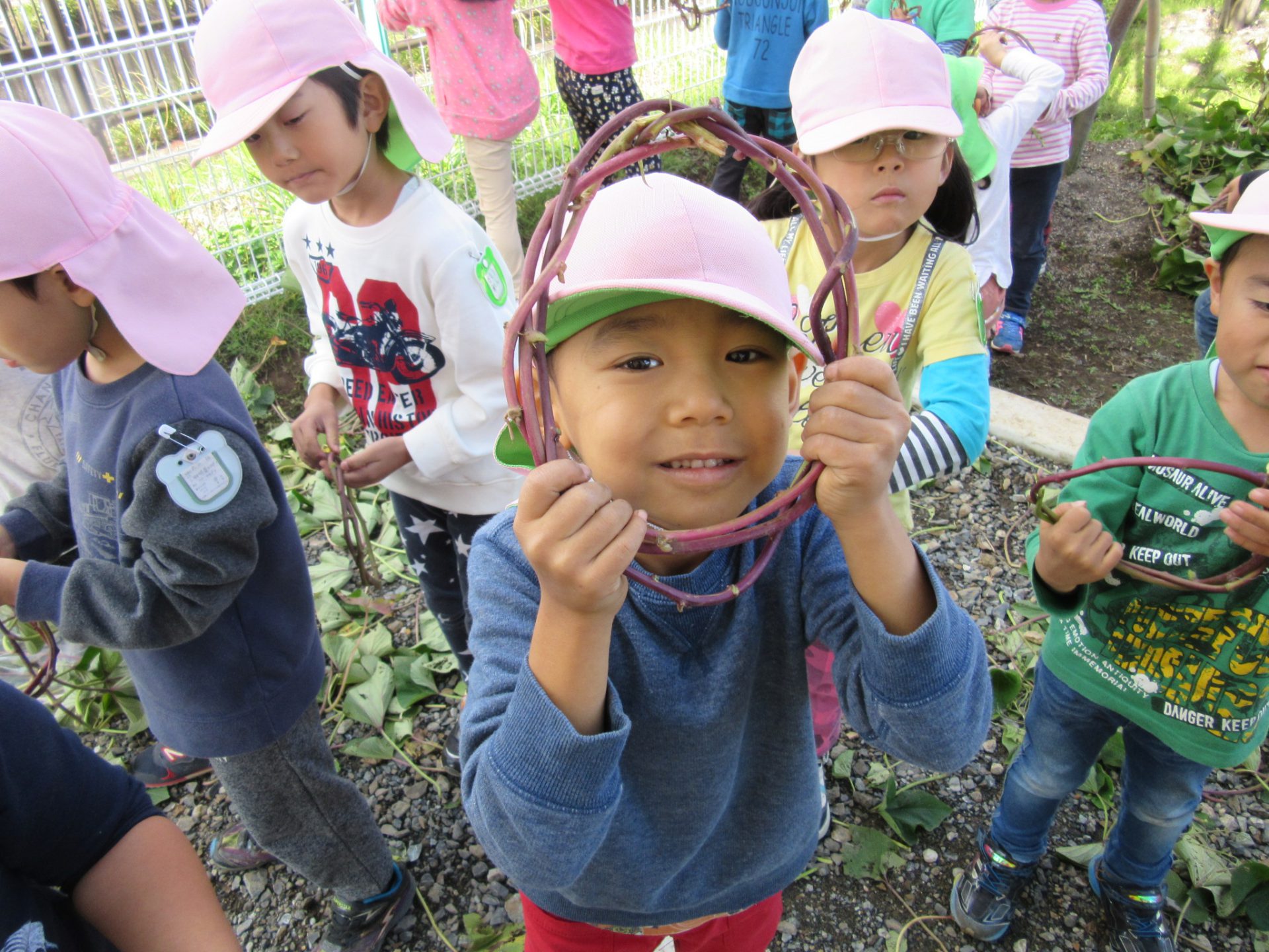 子ども達は、収穫が終わった後のいものツルも制作に使えることを知り、丁寧に葉を取り、長いものを探して土台作りをしていました。