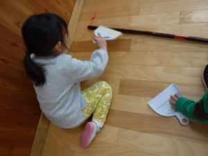 年長さんが「ねぇねぇ、できたぁ?」と話している後ろで、ちょっと様子を見ている子も・・