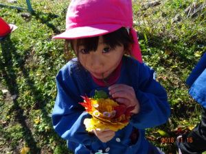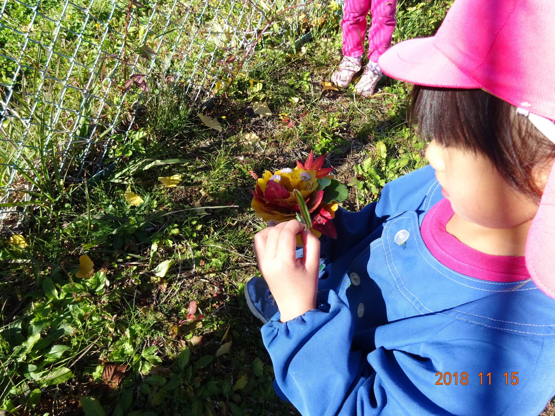 大きないちょうの葉を集めると、バラのようになることを知り、夢中になって集めた子ども達。そのうちにもみじやタンポポなどの草花を使ってアレンジを始めました。