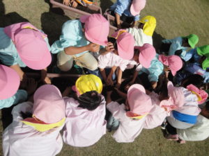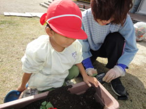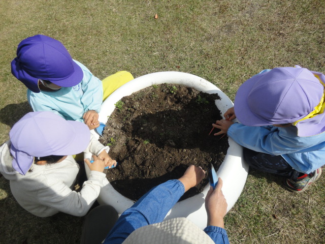 お友だちと一緒に土と肥料を混ぜ合わせ、球根の形や感触に触れました。チューリップの花が咲くのは来年。年長さんになる期待とともに、お花も一緒に生長してくれることを楽しみにしています。