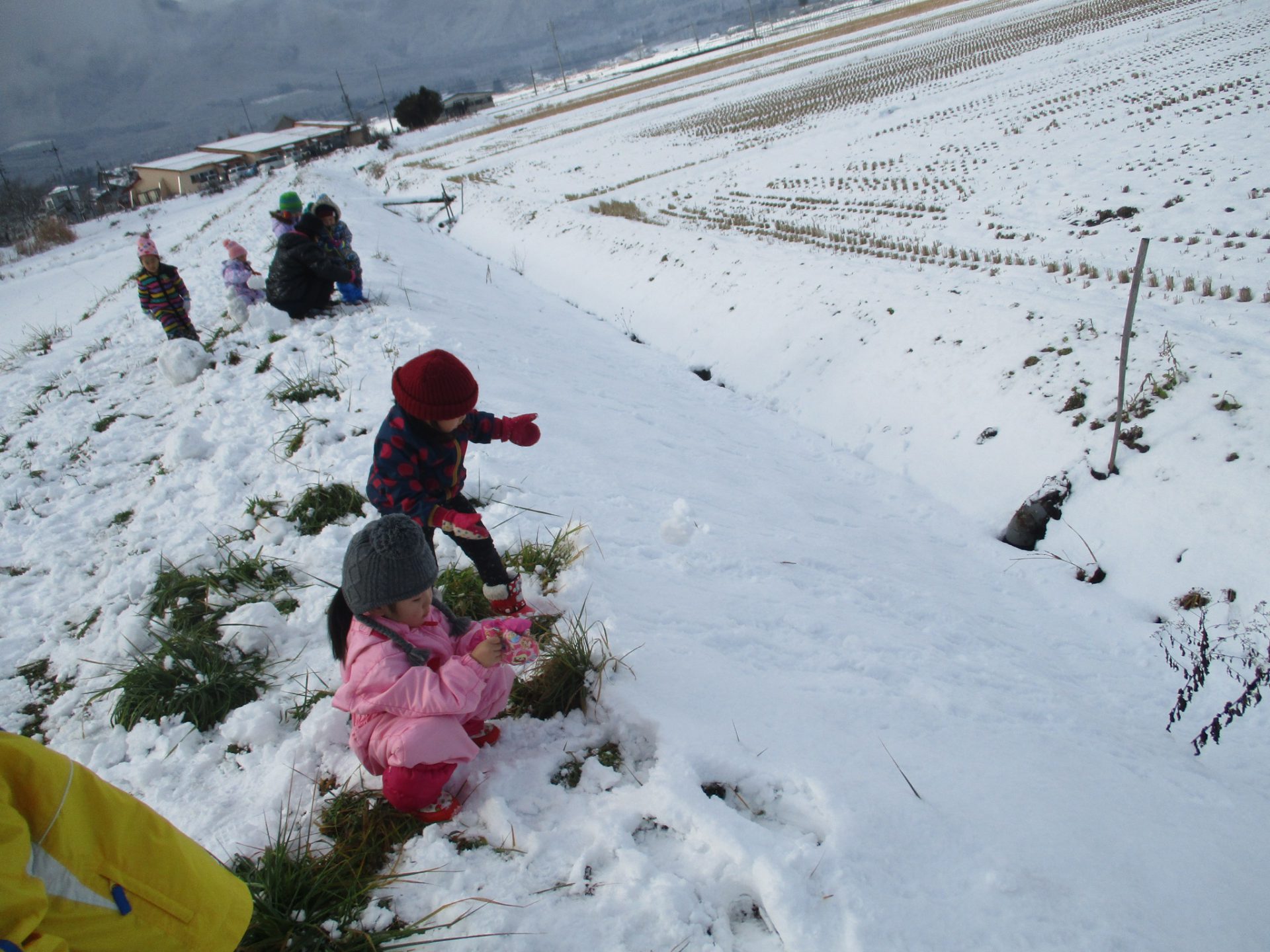 やっと雪遊びができるほど雪が降った日には、園舎裏の農道まで出かけに行きました。