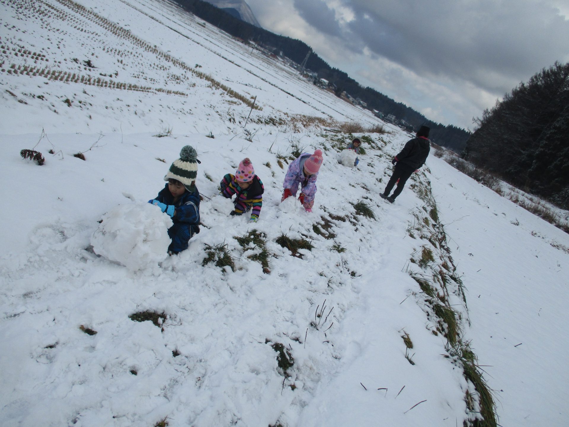 「重たいよ〜!」小さな雪玉を転がして大きな雪玉を作ったり、少ない雪でもいろいろな遊びを思いつく子ども達は、遊びの名人だなと感心しました。