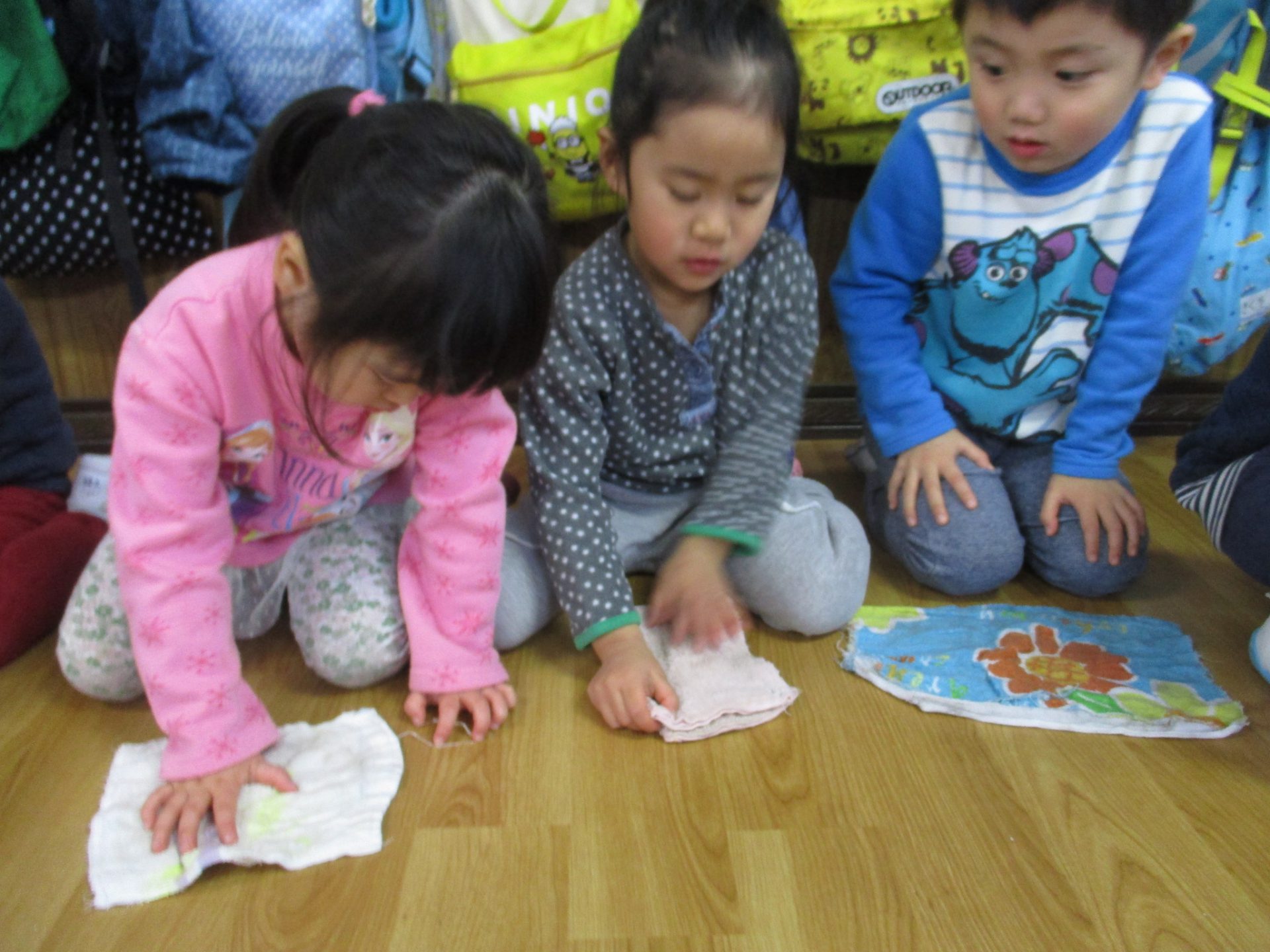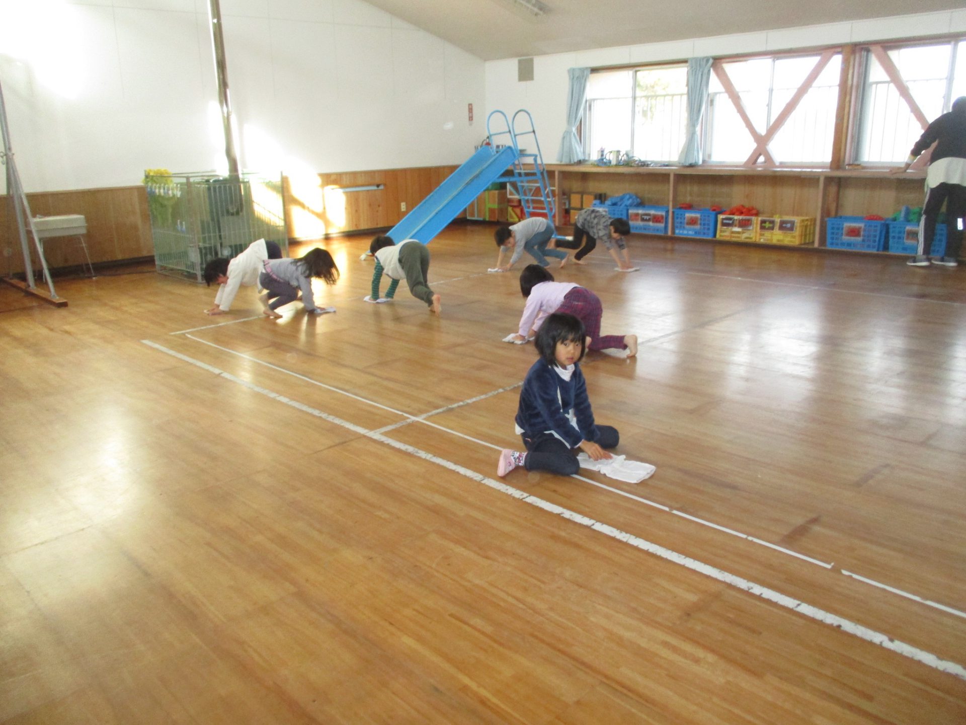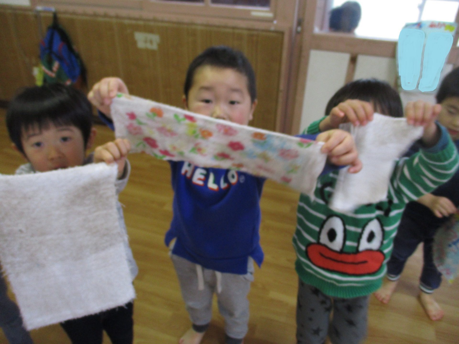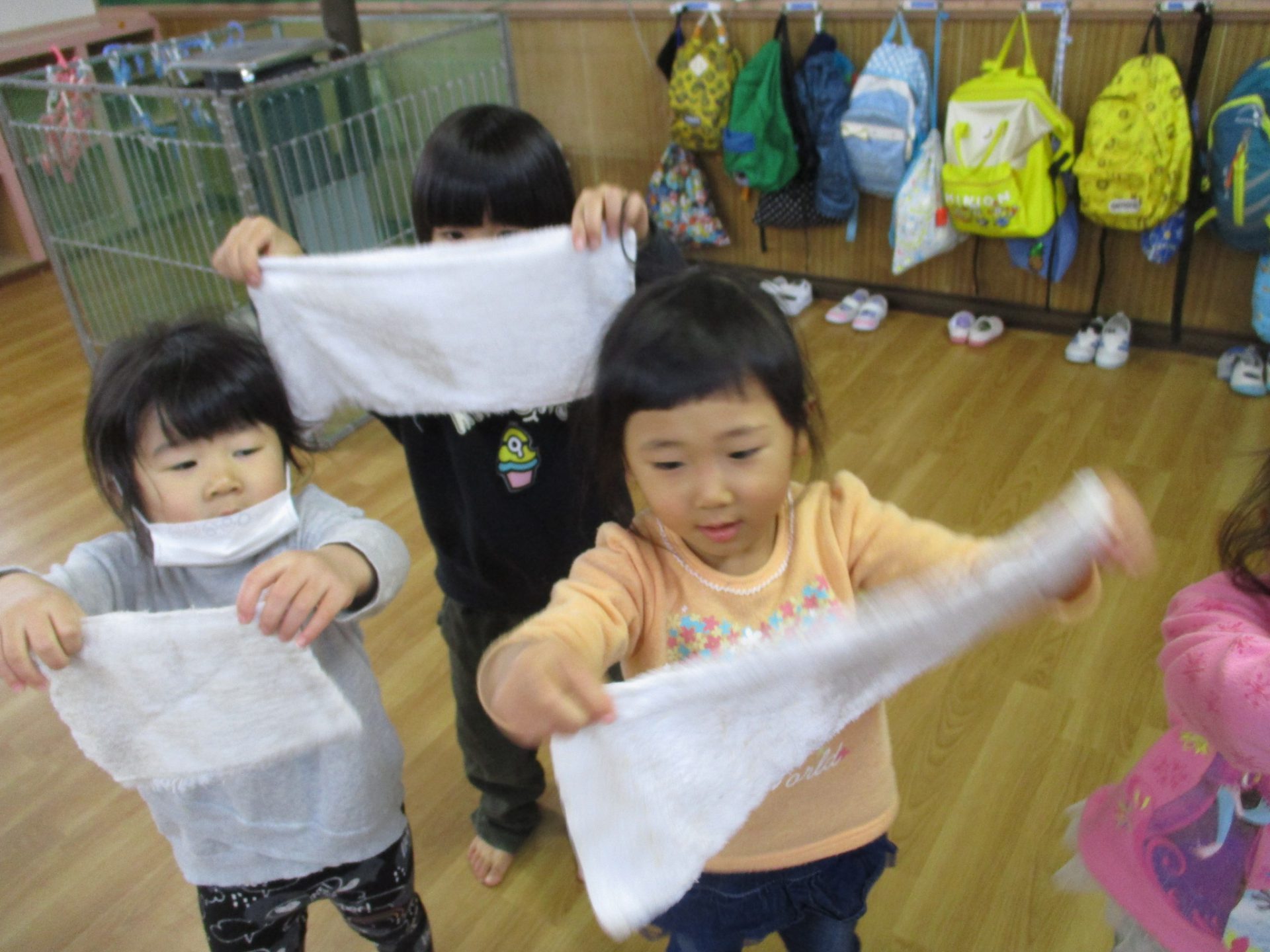 以上児みんなで大掃除を行いました。年少さんは2回目の大掃除。自分から汚れを見つけてきれいにしたり、友だち同士で汚れを探し合ってきれいにしようとする姿がありました。汚れた雑巾を見たときの子ども達は「こんなに汚れてる!!!」と、自分できれいにした達成感を感じているようでした。年中・長さんは、毎日雑巾掛けをしていることもあり、雑巾の絞り方から掛け方まで自信を持って取り組んでいるようでした。毎日繰り返し行うことで、習慣化し、心地よさや満足感を感じているのだなと感じました。日々の保育の中で、繰り返し行うことを大切にし、子ども達に、達成感を感じたり、自信をもって活動することの心地よさを感じたりしてもらえるようにしていきたいと思います。