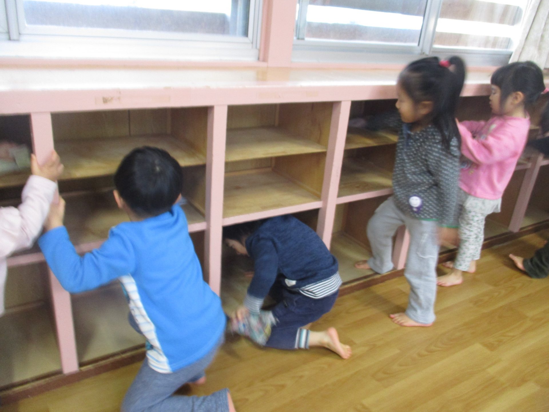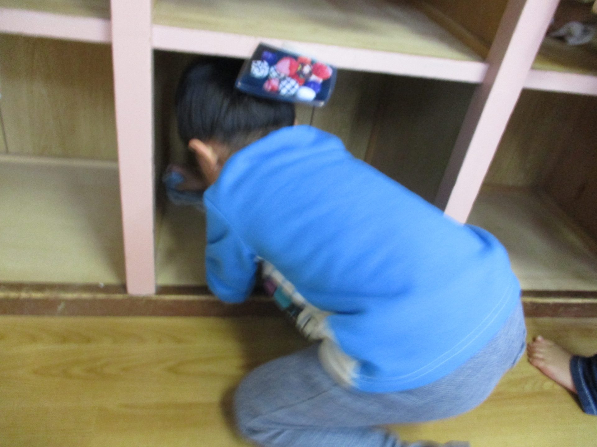 「どこどこ??」と、それに気がついた子たちが棚を磨きます。お掃除の達人がいっぱいです!