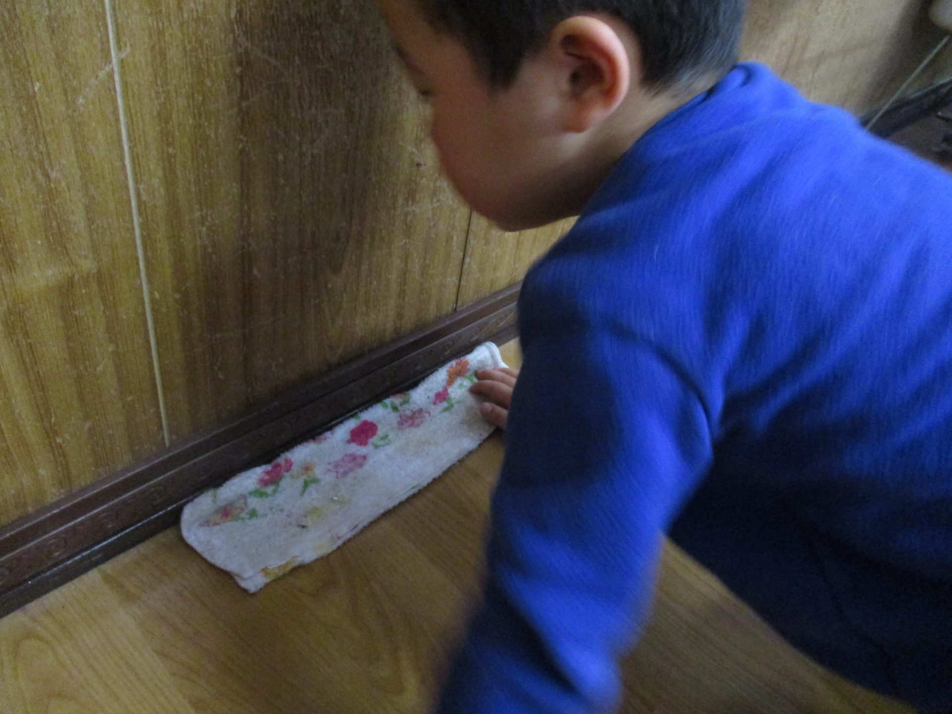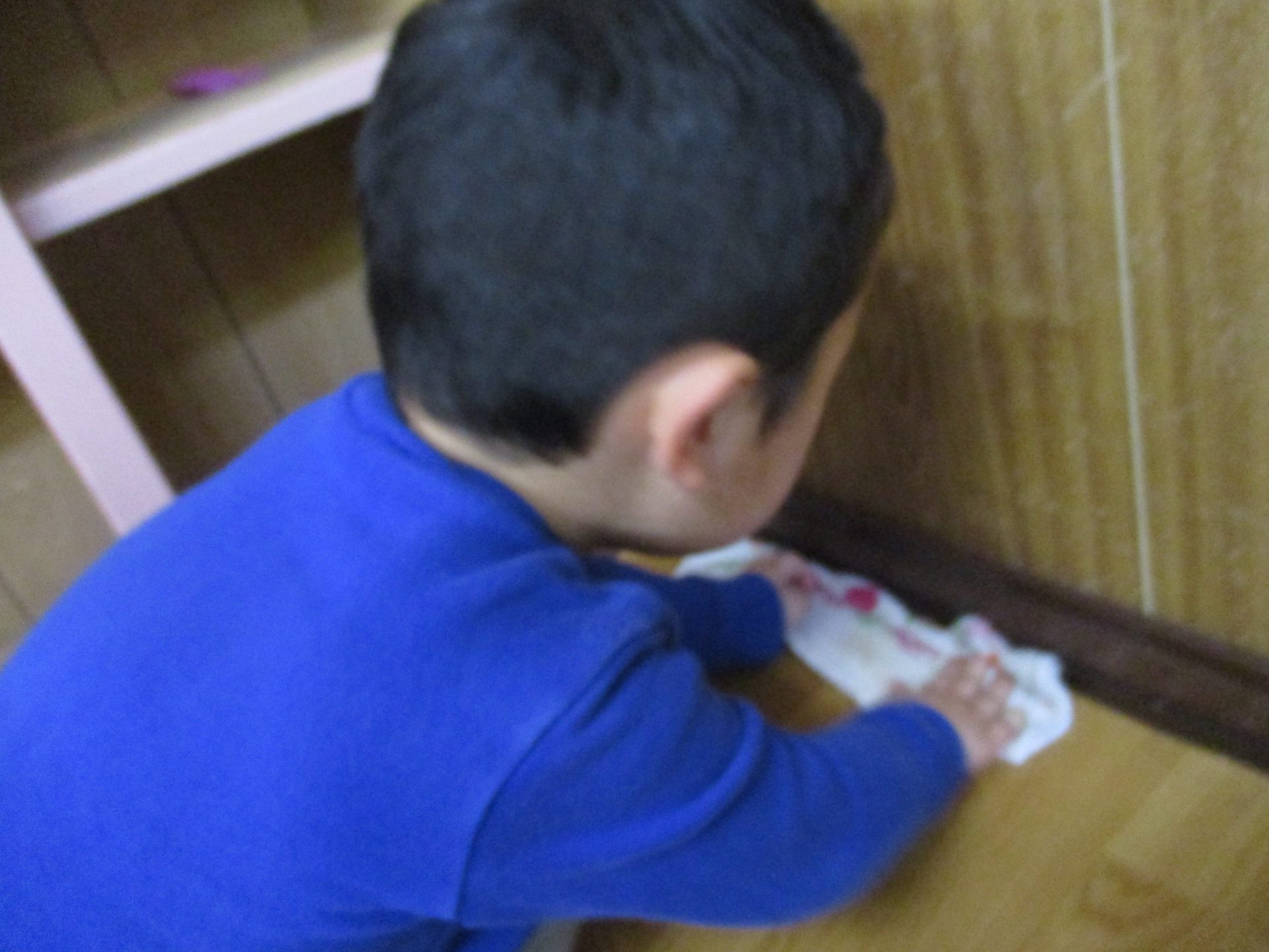 部屋の隅の汚れに気がつき拭いています。隅々まできれいにしようとする気持ちが伝わってきますね。