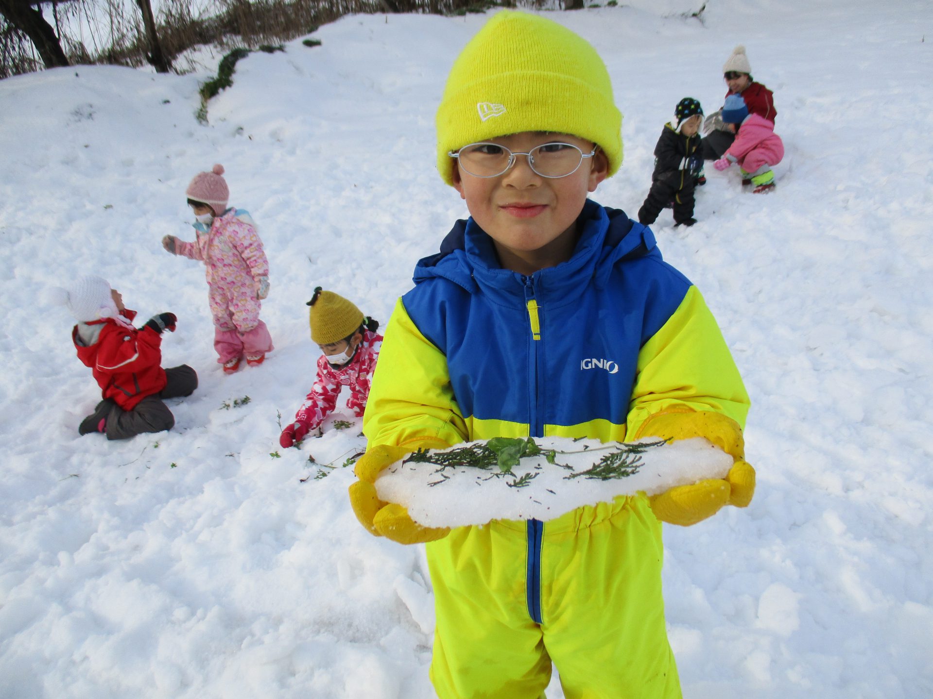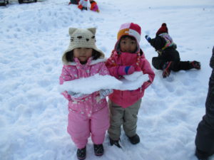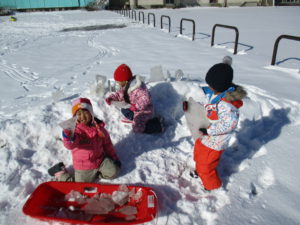 いよいよ、本格的な雪遊びシーズンがやってきました。毎日の楽しみにもなっている、雪遊び。日々、色々な雪を見て、触れて、感じながら様々な雪遊びを楽しんでいます。様々な形に変容する雪でイメージを膨らませ、いろんな遊びができる雪だからこそ、子ども達は雪遊びが大好きなんだと思います。