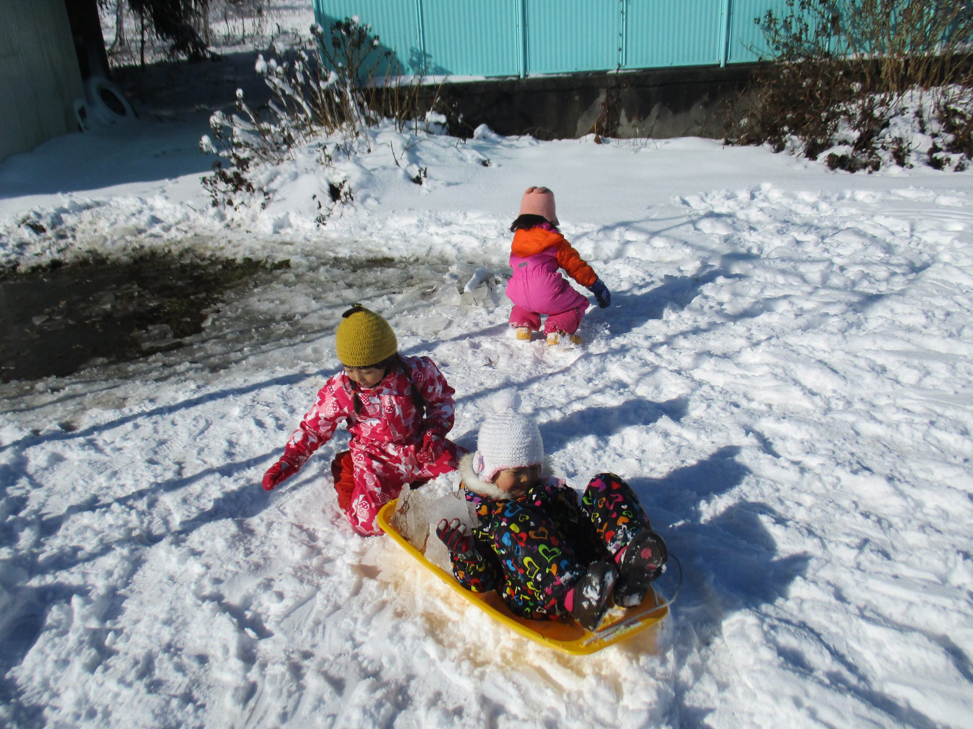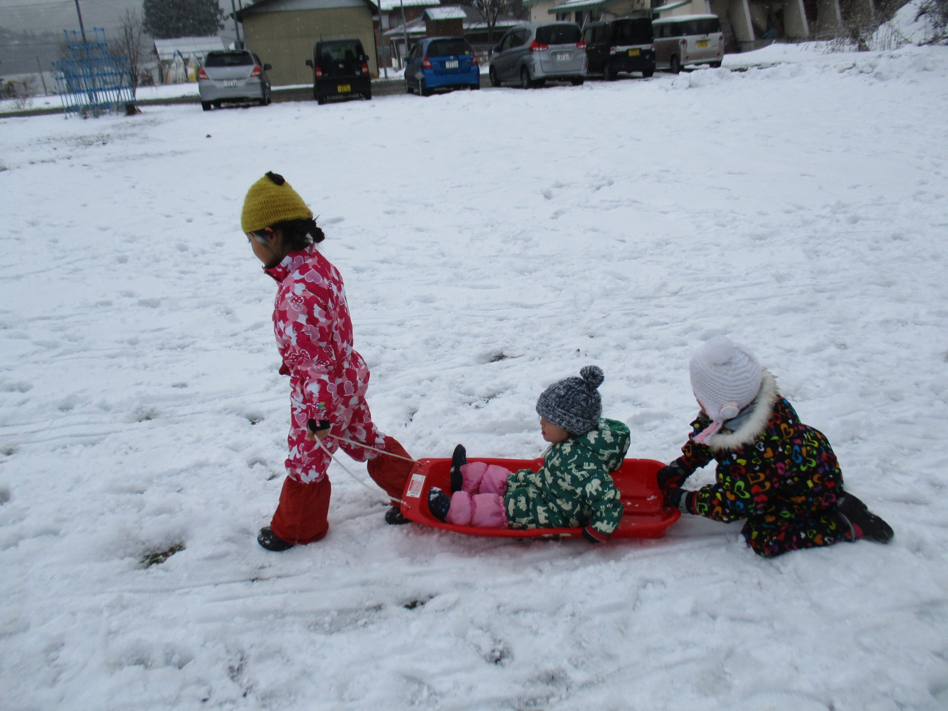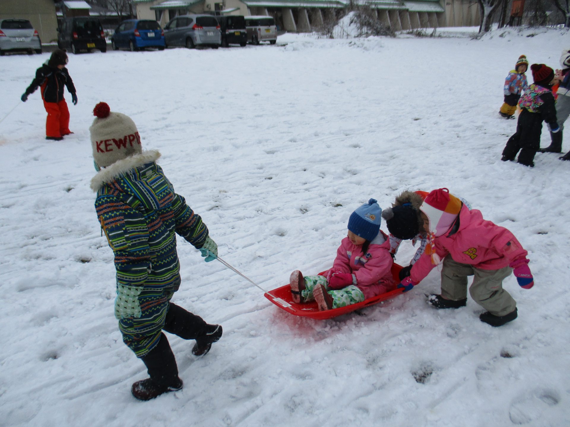また別の日には、ソリは全員分ないので順番で使うのですが、自然に年長さんが小さいお友達を乗せて引っ張ってあげていました!年中さんが後ろから押して、年長さんをサポートしてくれています!