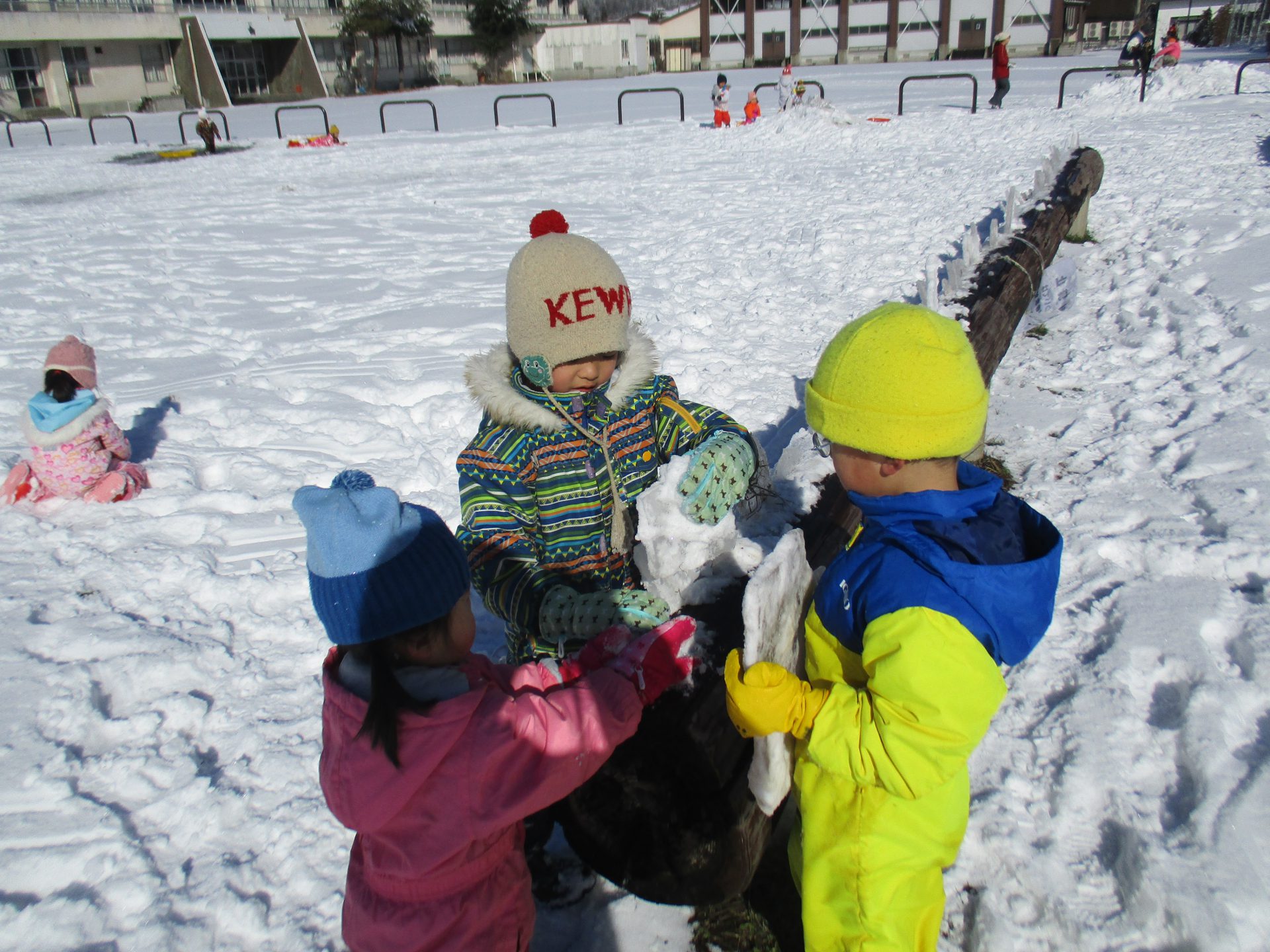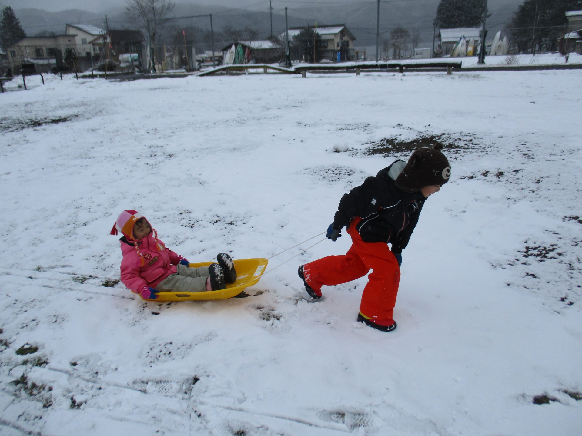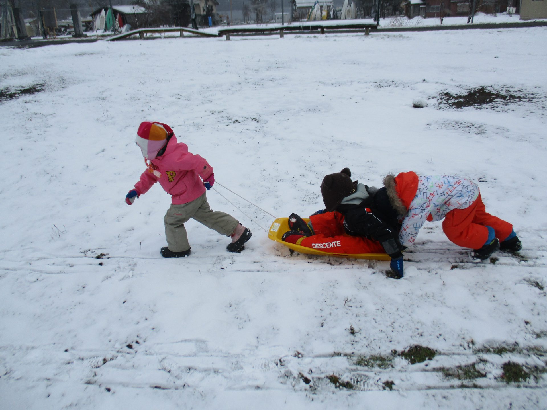 また別の日には、ソリは全員分ないので順番で使うのですが、自然に年長さんが小さいお友達を乗せて引っ張ってあげていました!年中さんが後ろから押して、年長さんをサポートしてくれています!