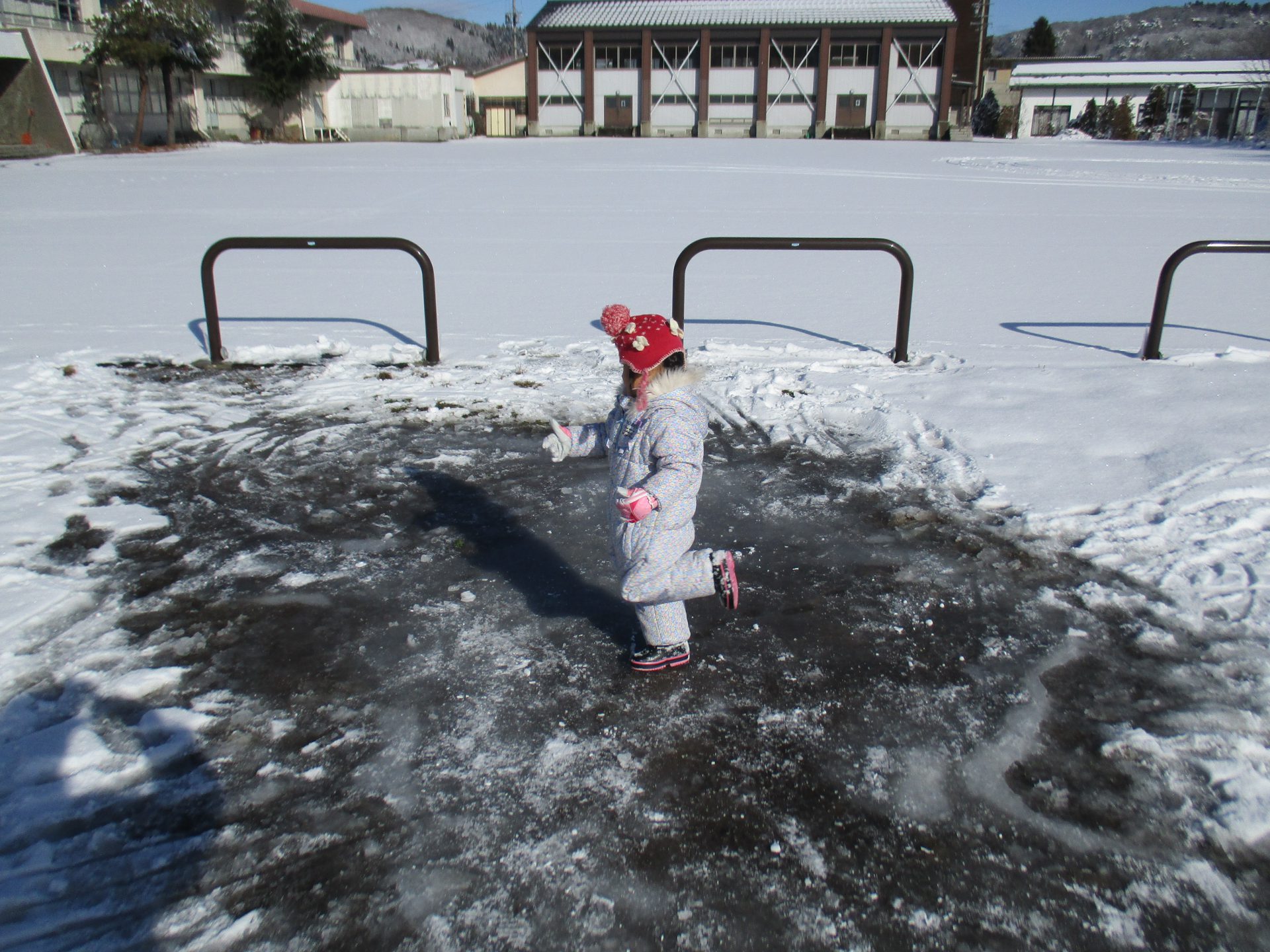 またある日は、前日暖かく、雪が解けて水たまりになっていた所が凍ってスケートリンクになった日もありました!