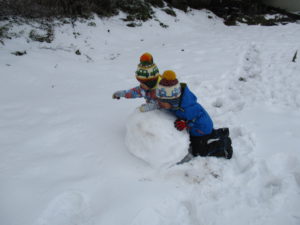 未満児さんが大きな雪玉を転がしていると、年長さんの助っ人が登場! 「今日の雪はよく固まるね!」