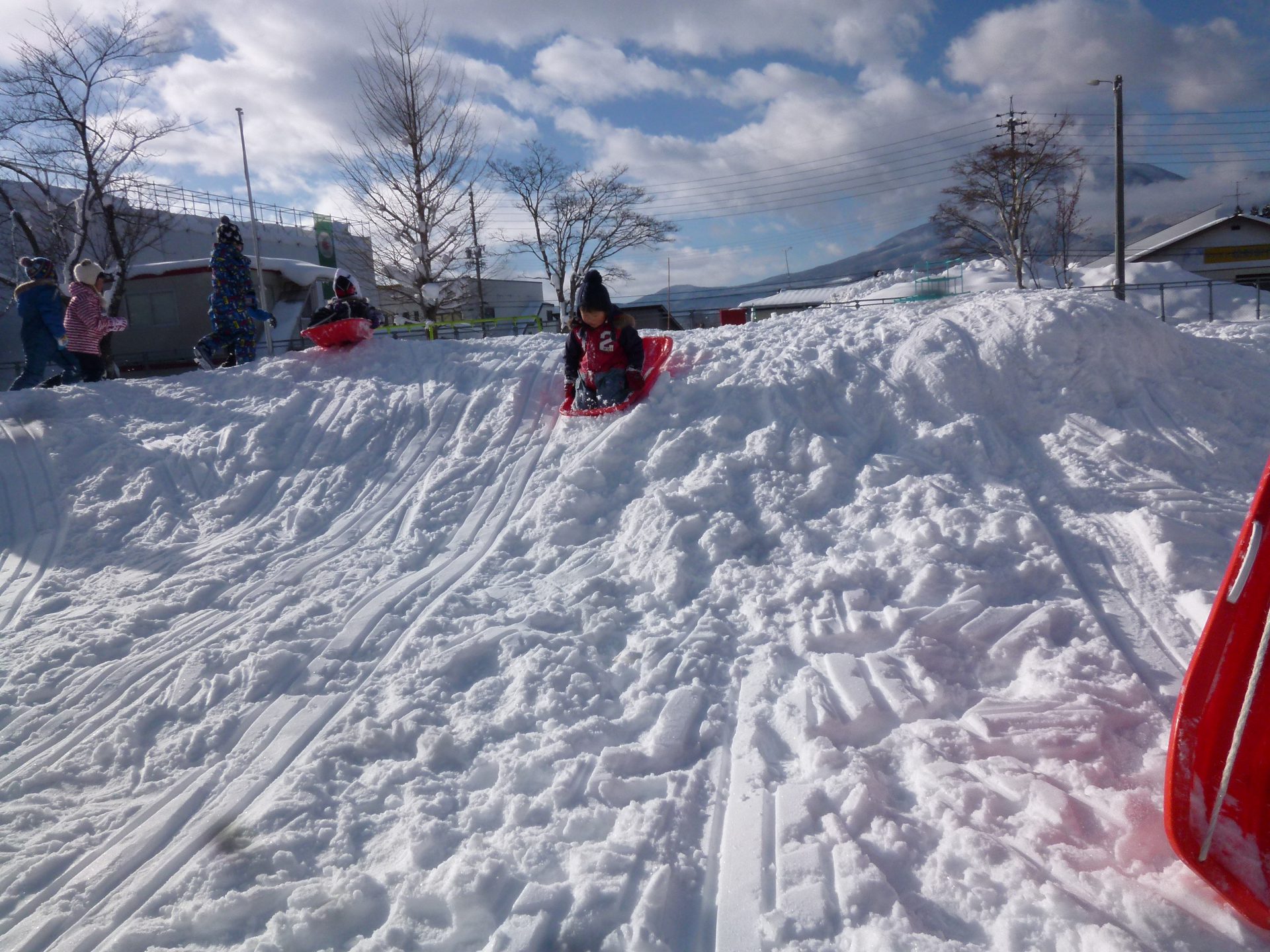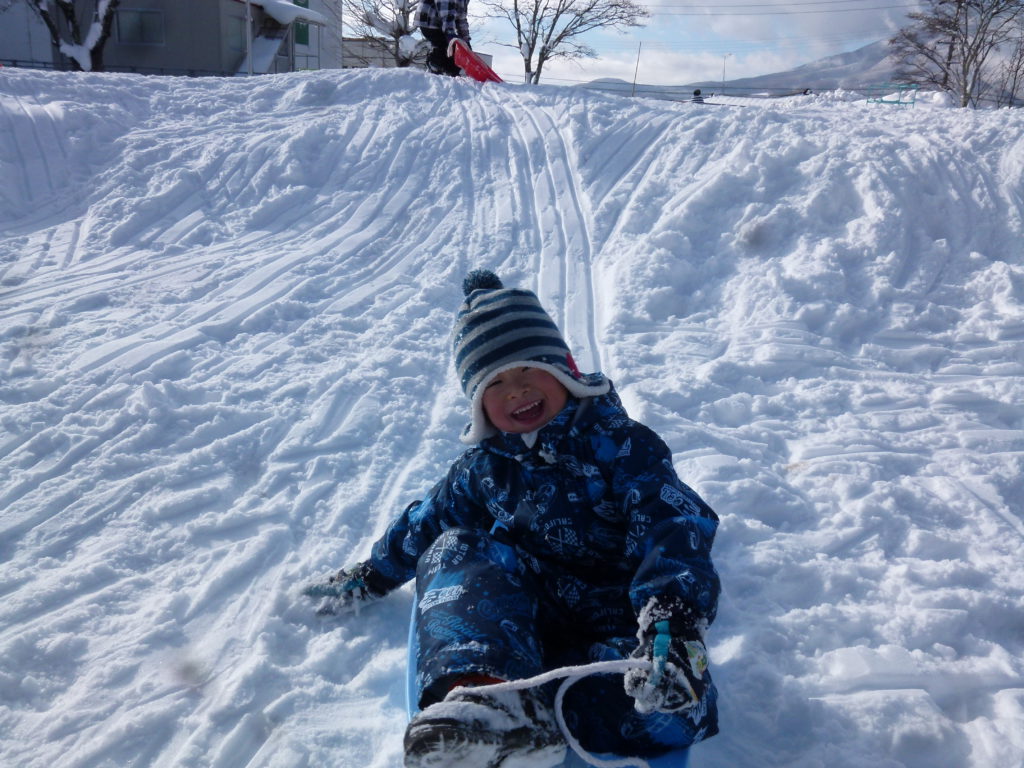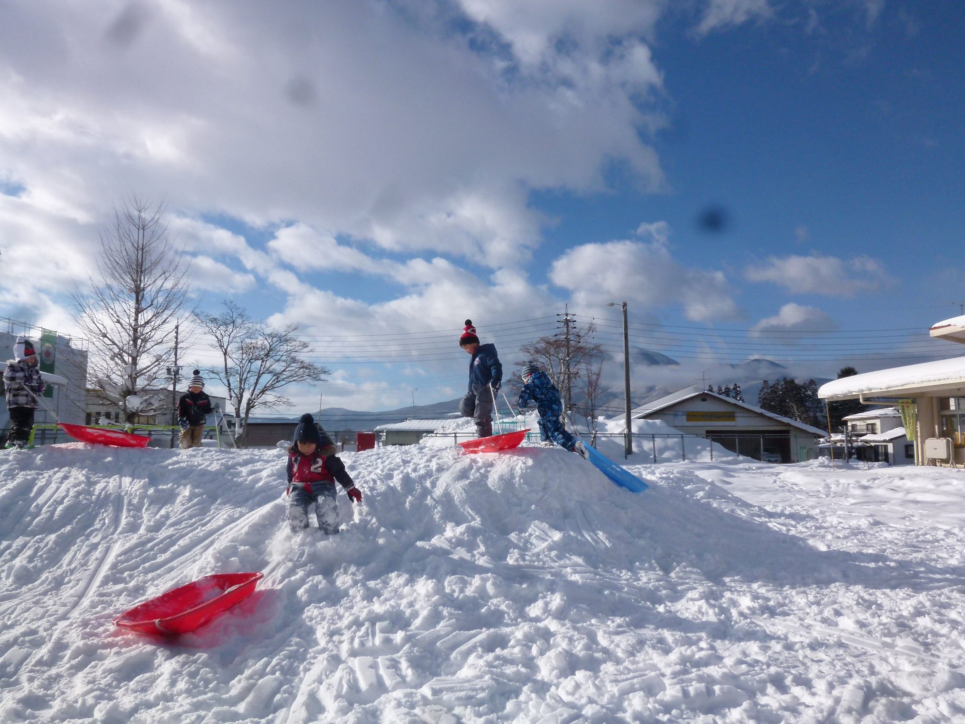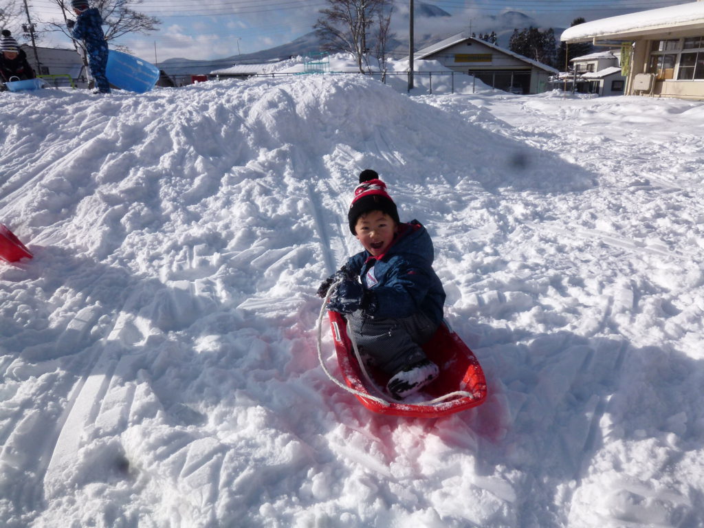 この時期にしかできない雪遊び。しかも、信濃町の降る雪の量は子ども達が思う存分楽しめる程です。雪遊びの中でも子ども達の遊ぶ姿は毎日変わっていきます。そり遊びでも、ただ滑るだけでなく、その時の気分で緩やかなコースを滑ったりスピードを楽しめるコースを滑ったり、でこぼこコースを滑ったり。