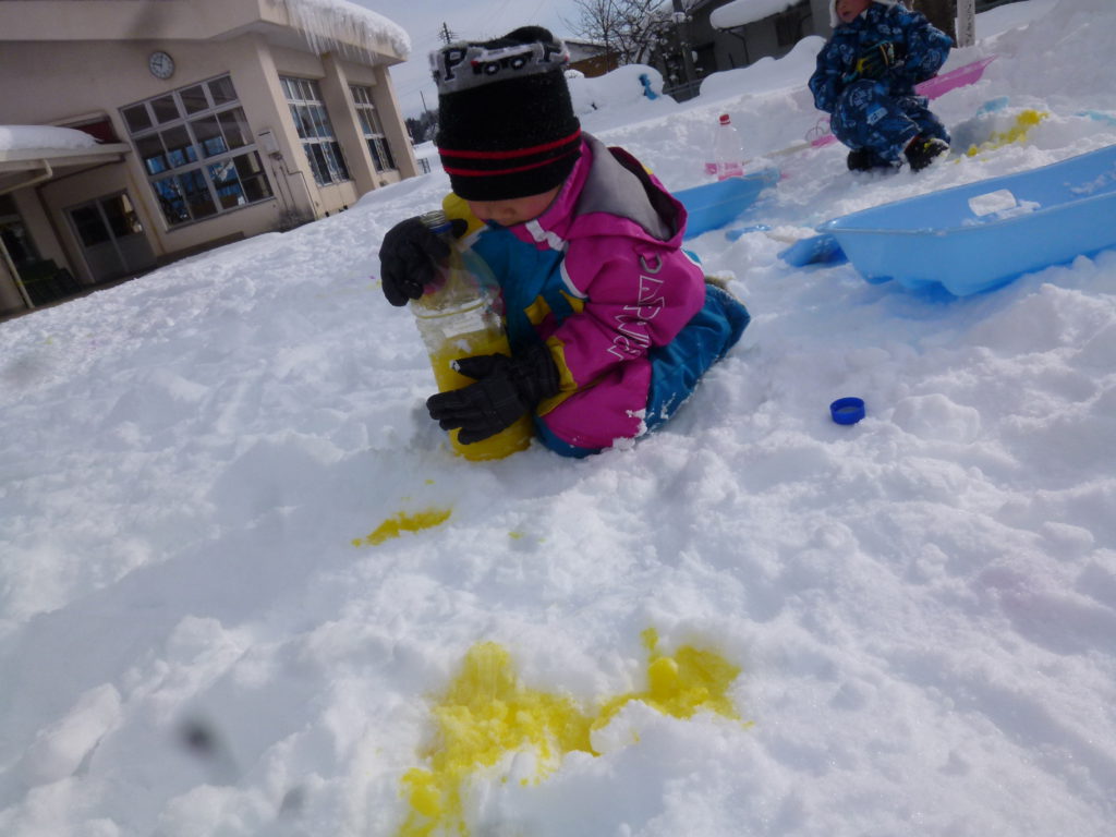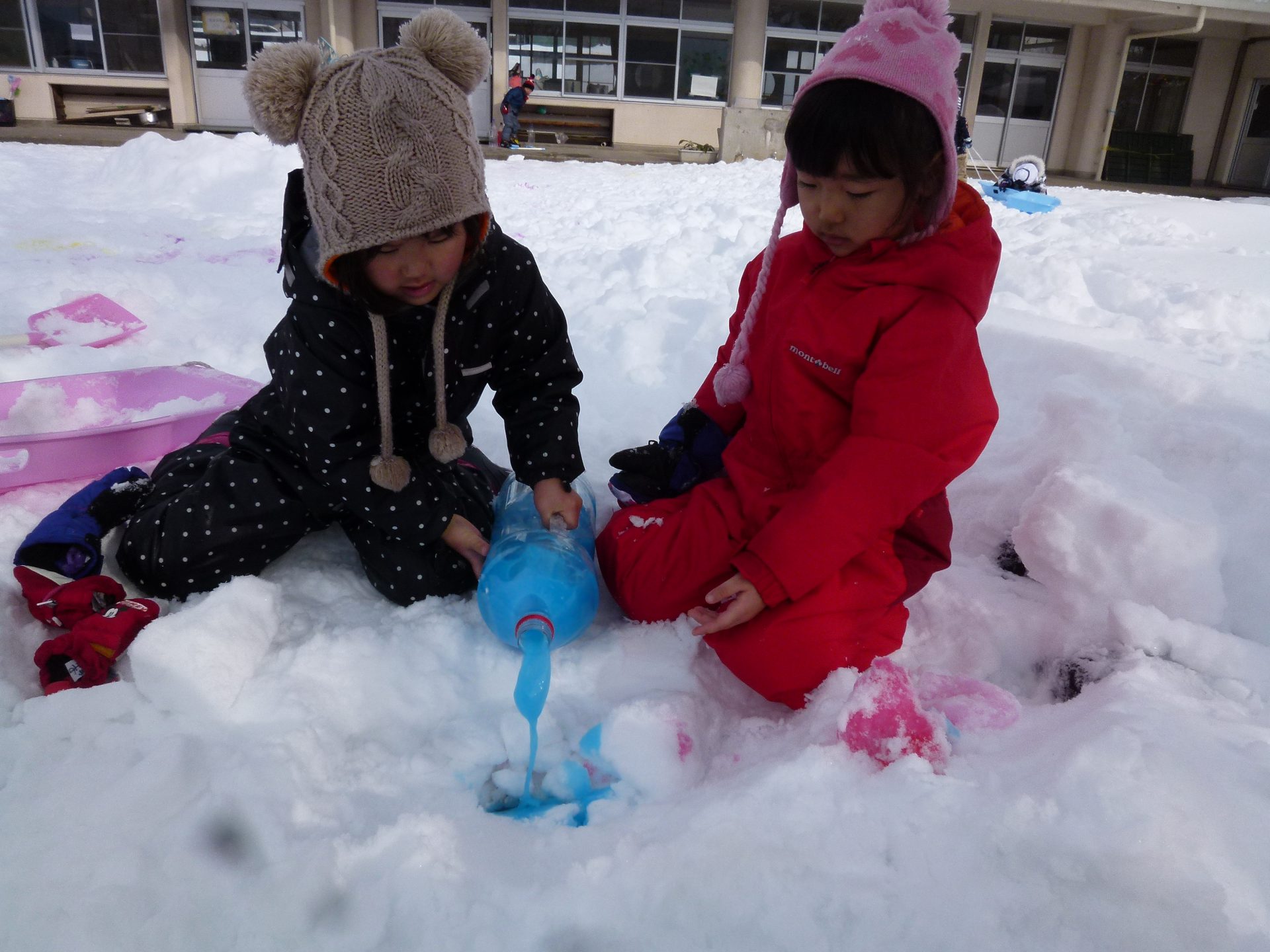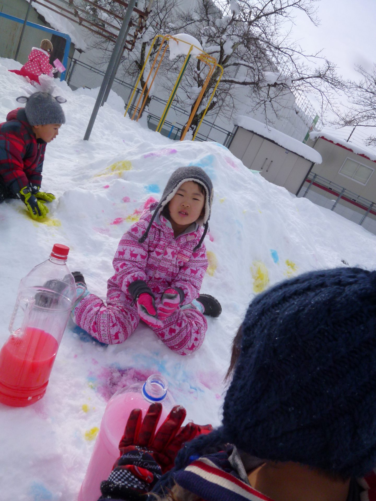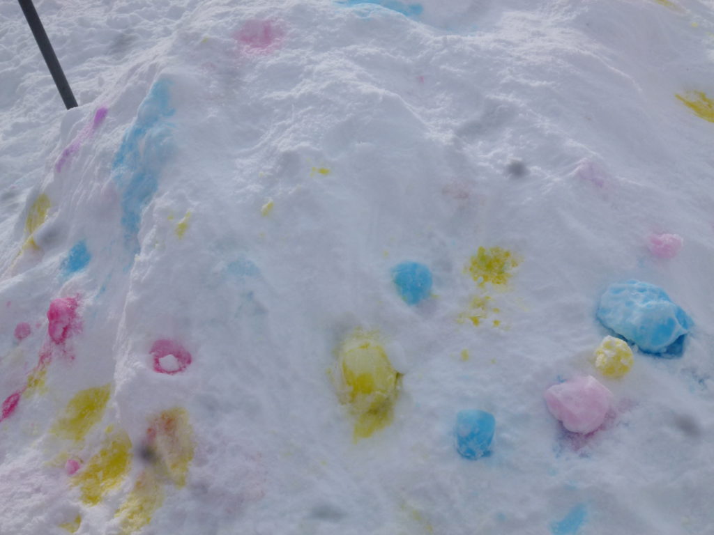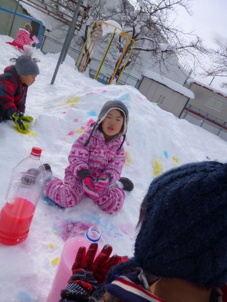 二人は友達が作った色のついた雪を少し分けてもらい、雪の表面を丸く型抜きし積み重ねて