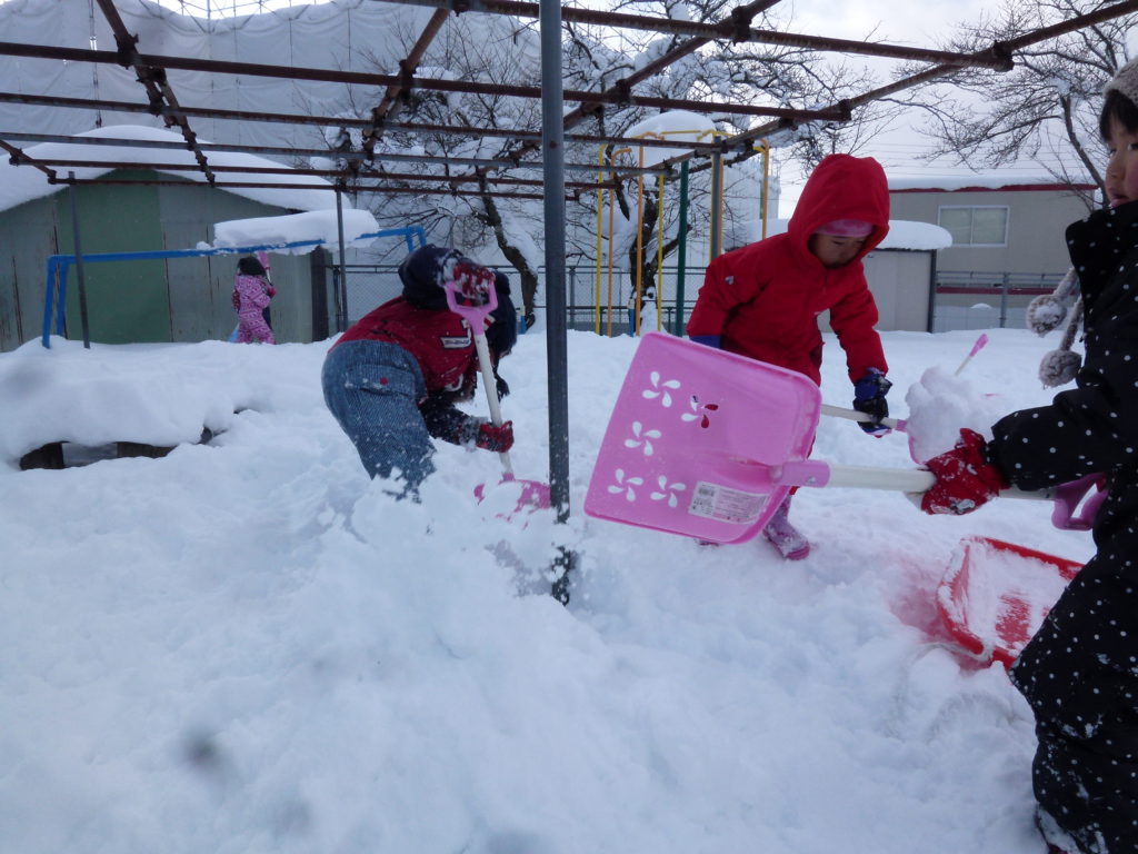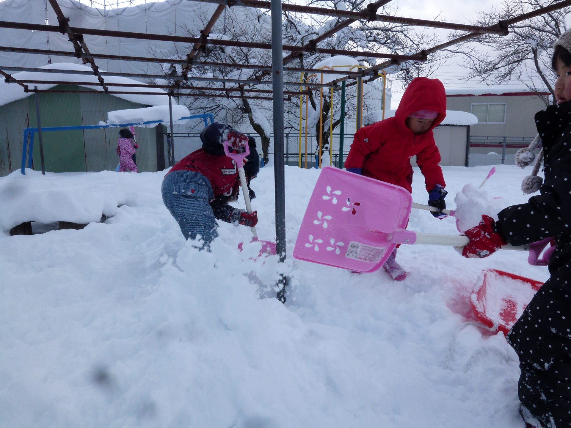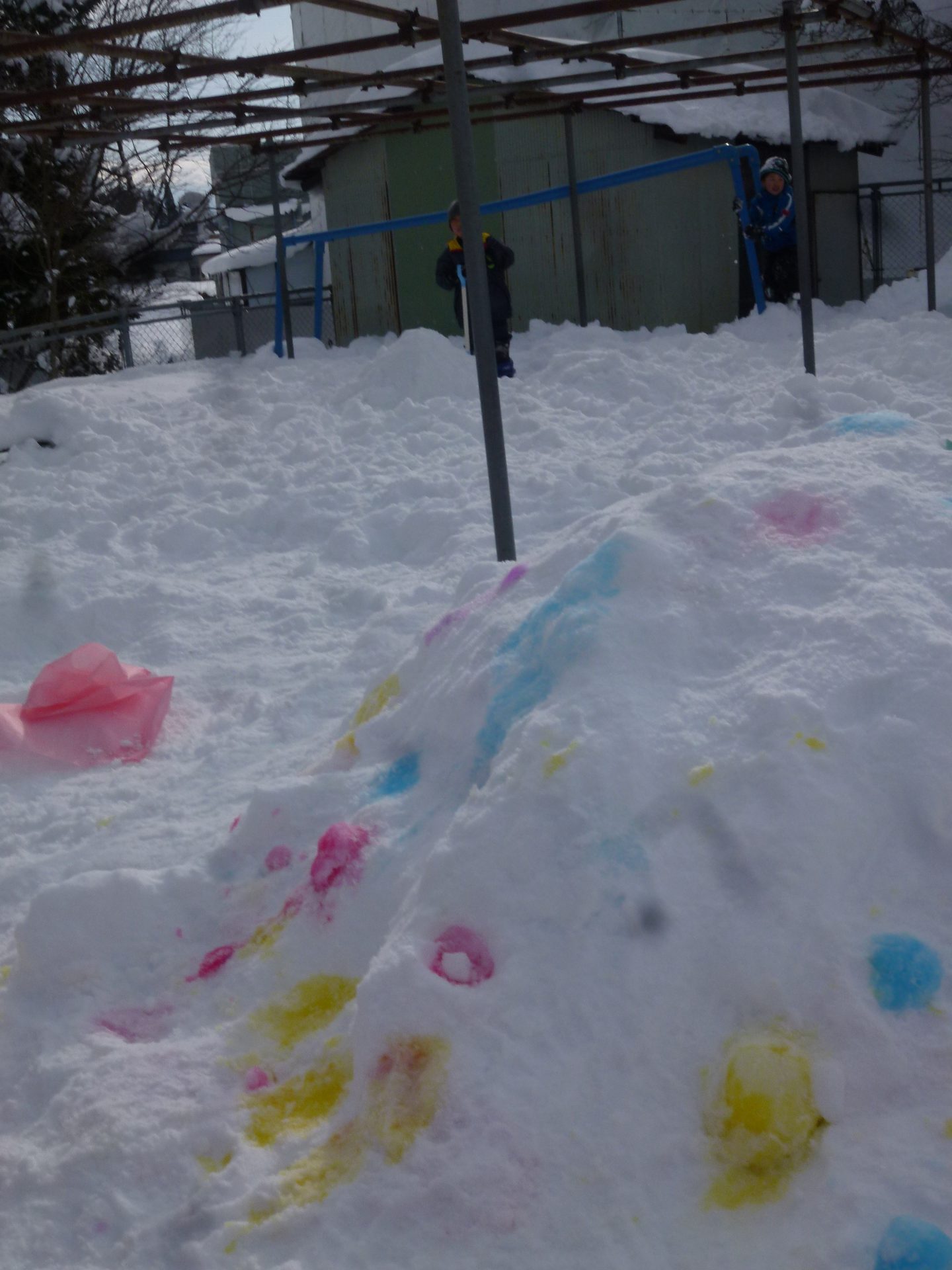 年末年始の休みの間に雪が降り、園庭にも毎年恒例の雪山ができました。