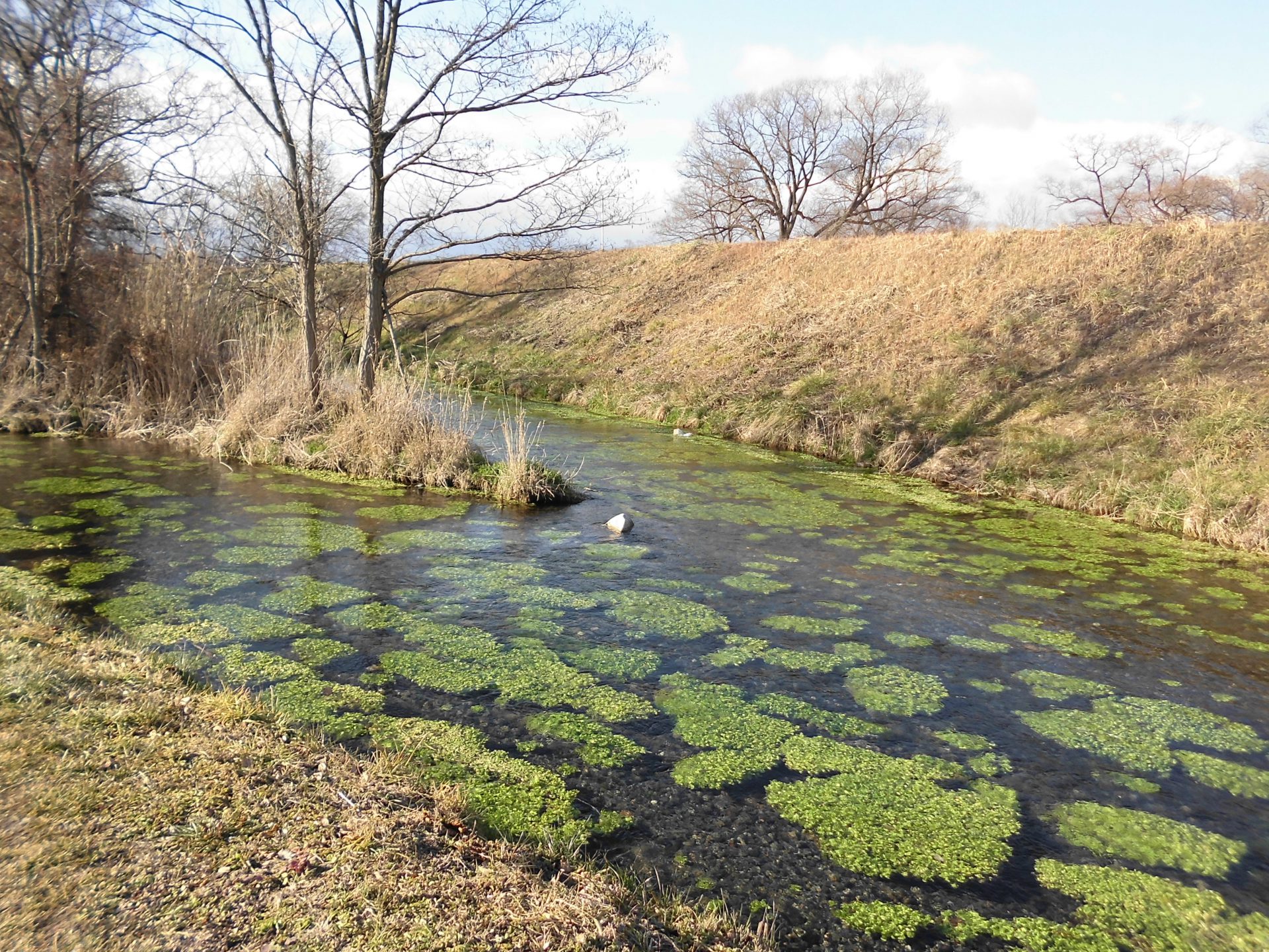 御宝田游水池の手前には、水草が透けて見える前川があり、橋を渡ると池が見渡せます。