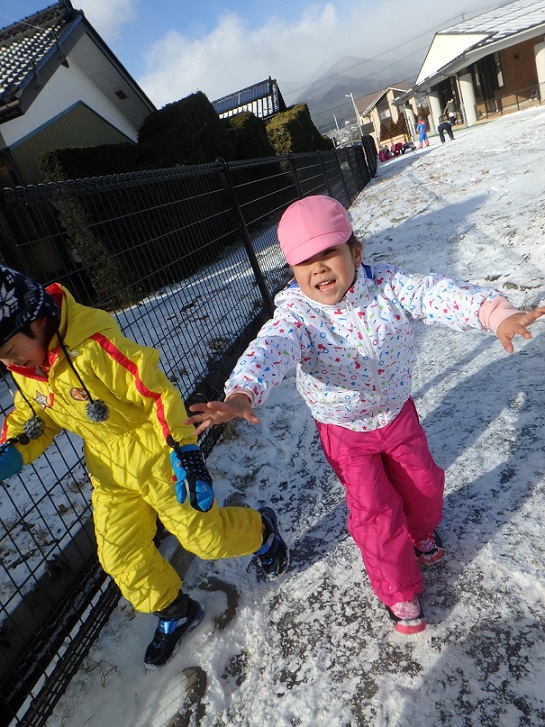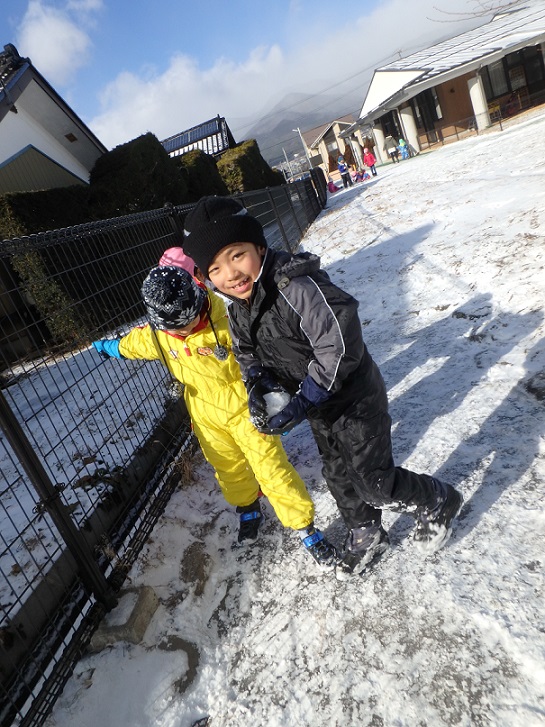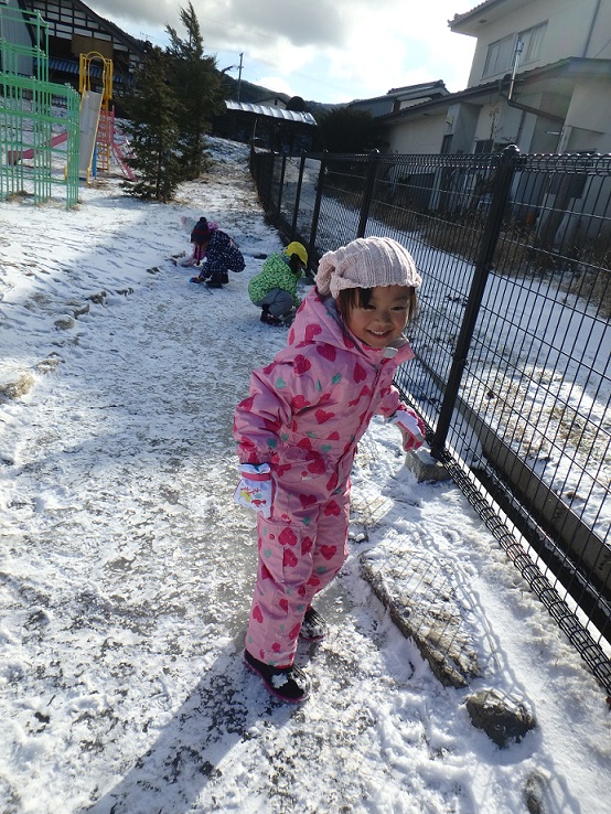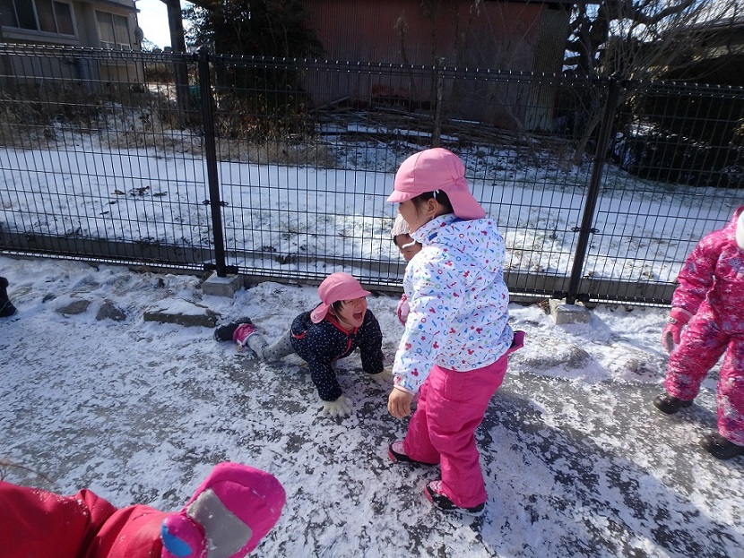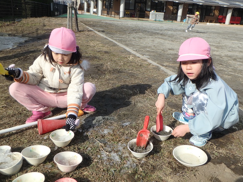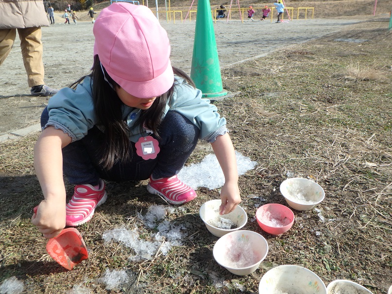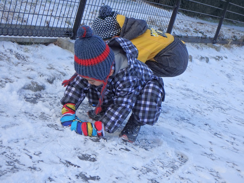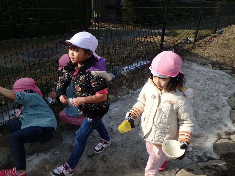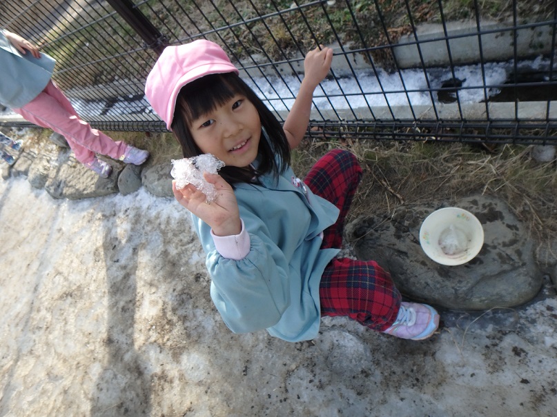冬になり通称ビオトープの氷もだんだん厚くなってきました。子ども達は氷を使って遊びを考えます。