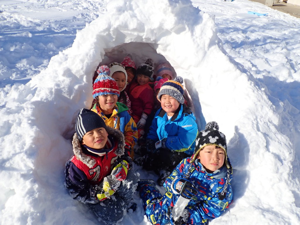 そのうちクラスの他の友達も呼んでみんなでかまくらに入っておうちごっこをしていました。